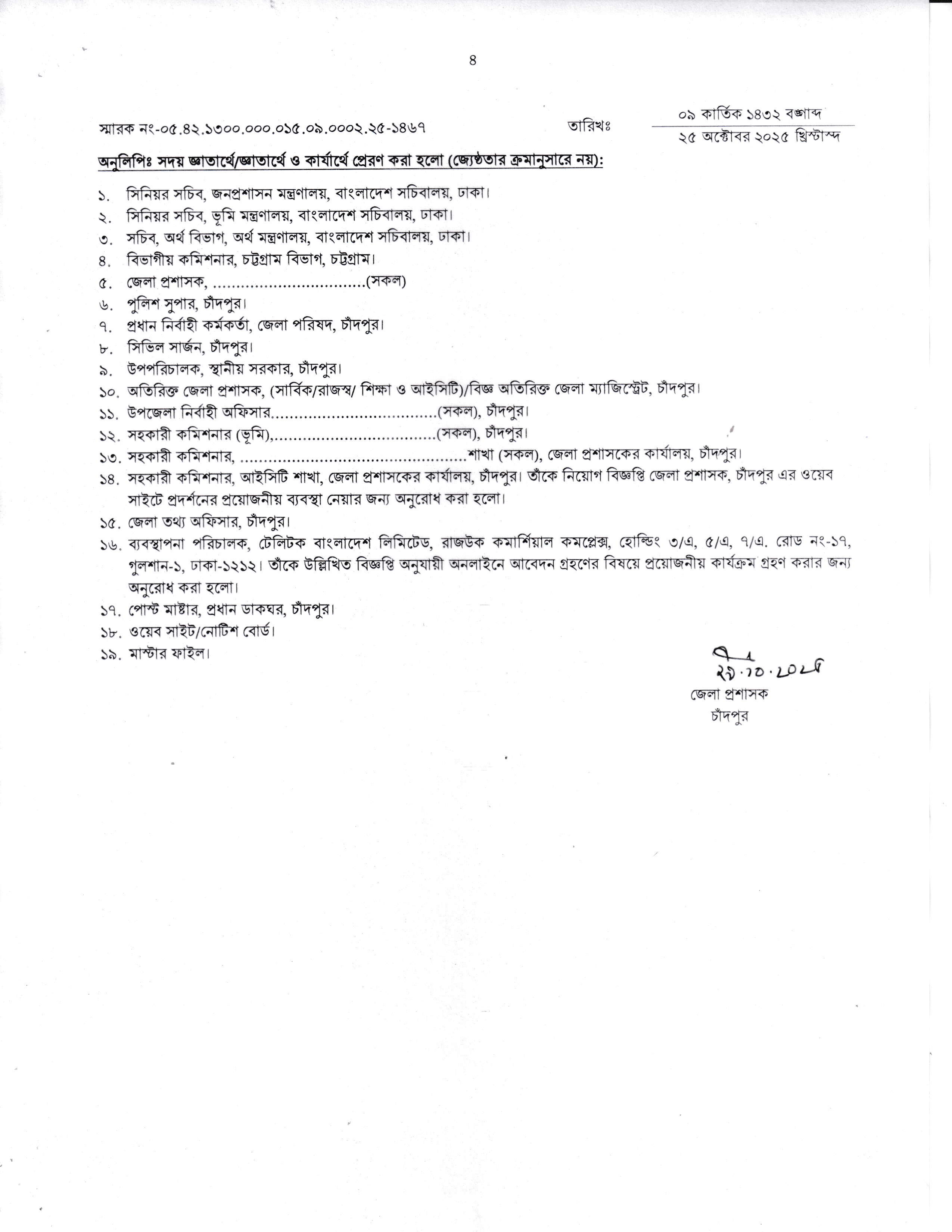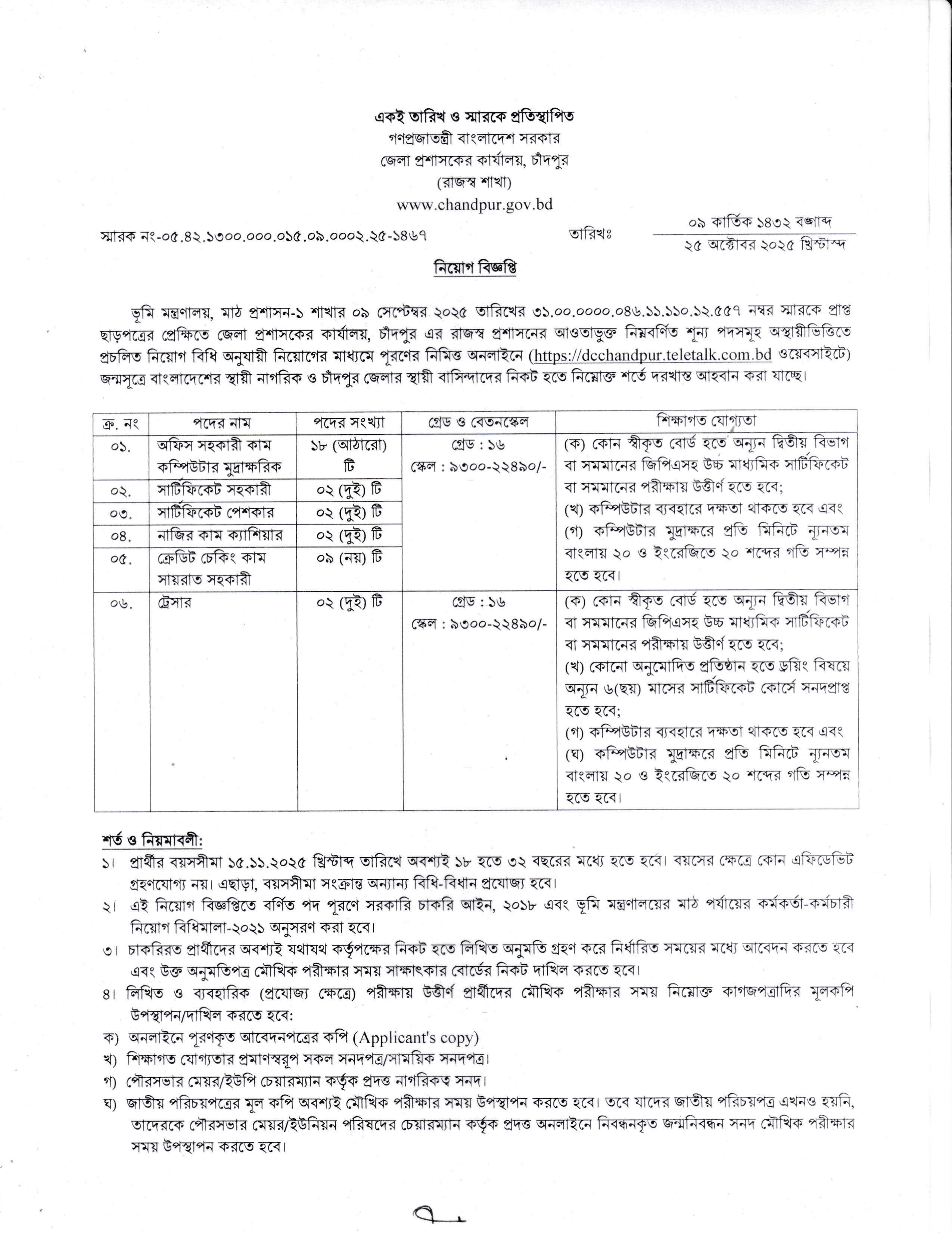 জেলা প্রশাসকের কার্যালয়, চাঁদপুর রাজস্ব প্রশাসনের আওতাভুক্ত শূন্য পদসমূহে অস্থায়ী ভিত্তিতে জনবল নিয়োগের জন্য একটি বিজ্ঞপ্তি প্রকাশ করেছে। এই বিজ্ঞপ্তির মাধ্যমে ৩৫টি পদে যোগ্য ও আগ্রহী প্রার্থীদের কাছ থেকে অনলাইনে আবেদন আহ্বান করা হচ্ছে।