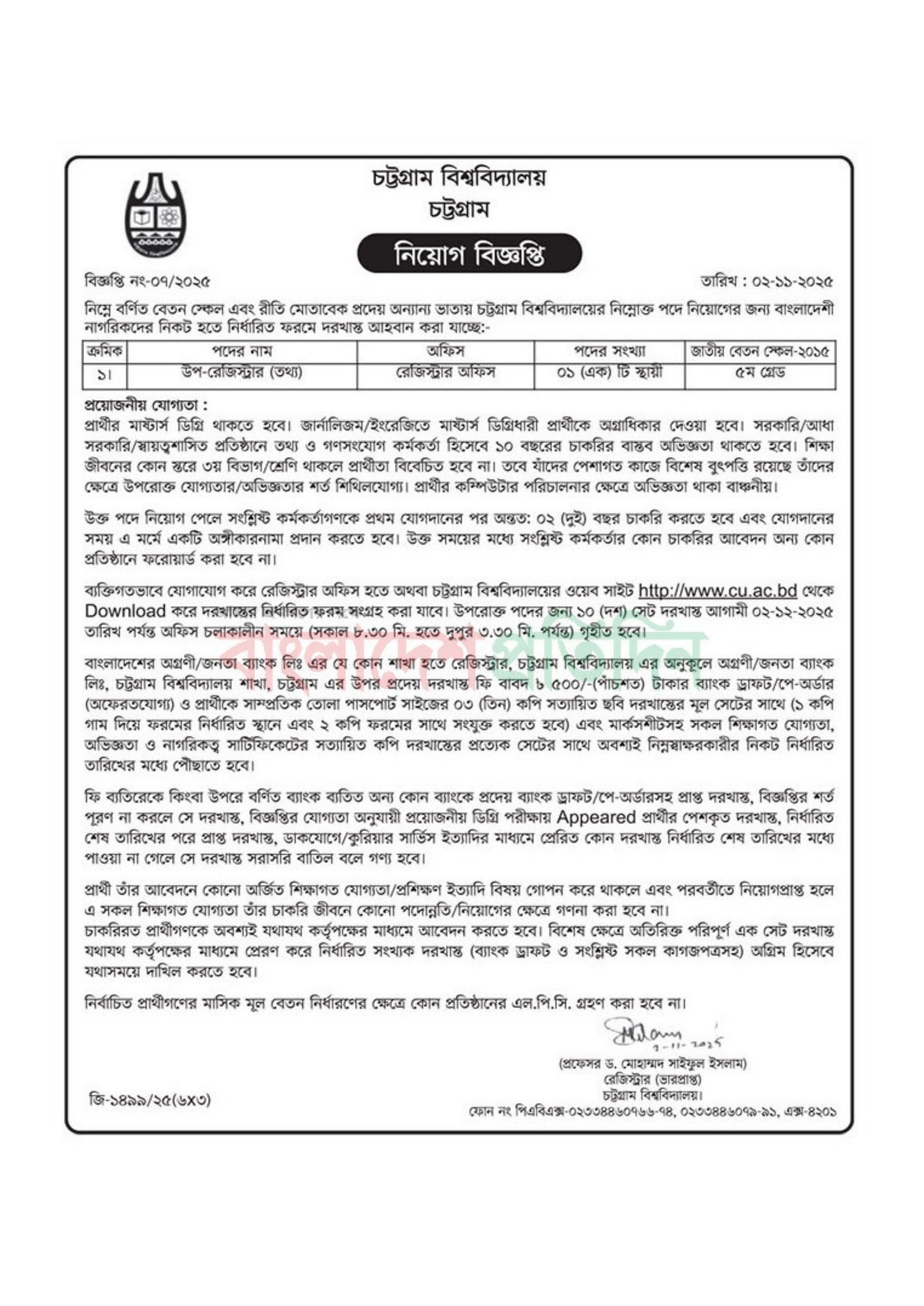 আবেদনের শেষ তারিখ: ০২ ডিসেম্বর ২০২৫ ইং, অফিস চলাকালীন সময় (সকাল ৮.৩০ মি. হতে দুপুর ৩.৩০ মি. পর্যন্ত)।
