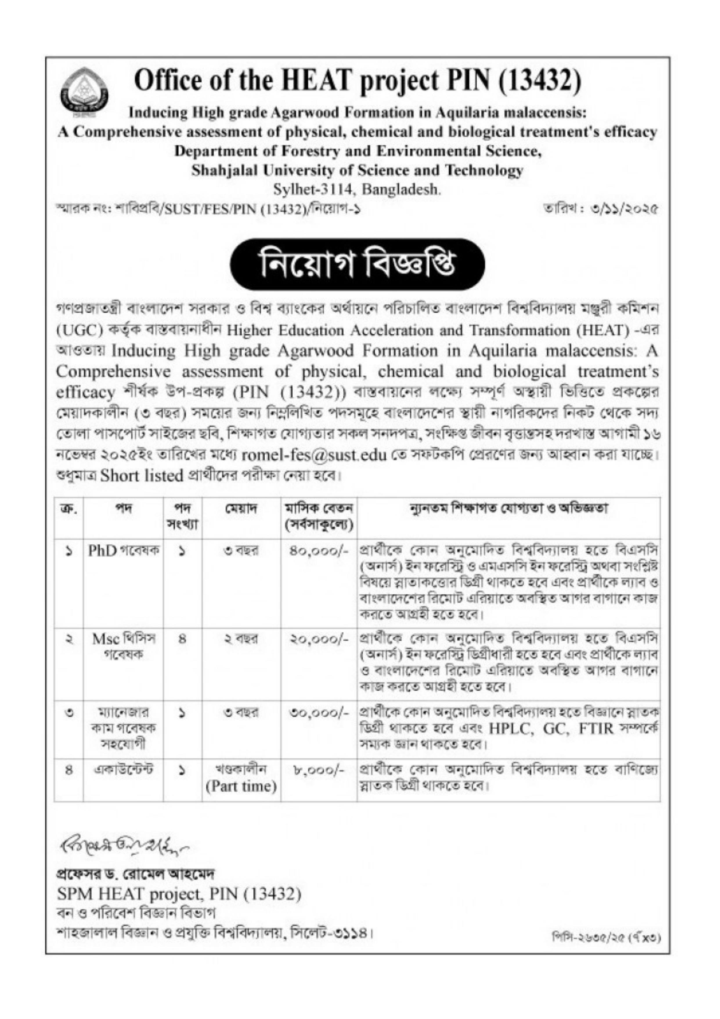 - সহ-গবেষক: প্রার্থীকে কোনো অনুমোদিত বিশ্ববিদ্যালয় হতে বিএসসি (অনার্স) ইন ফরেস্ট্রি ডিগ্রীধারী হতে হবে। প্রার্থীকে ল্যাব ও বাংলাদেশের রিমোট এরিয়াতে অবস্থিত আগর বাগানে কাজ করতে আগ্রহী হতে হবে। মাসিক বেতন: ২০,০০০/- টাকা।