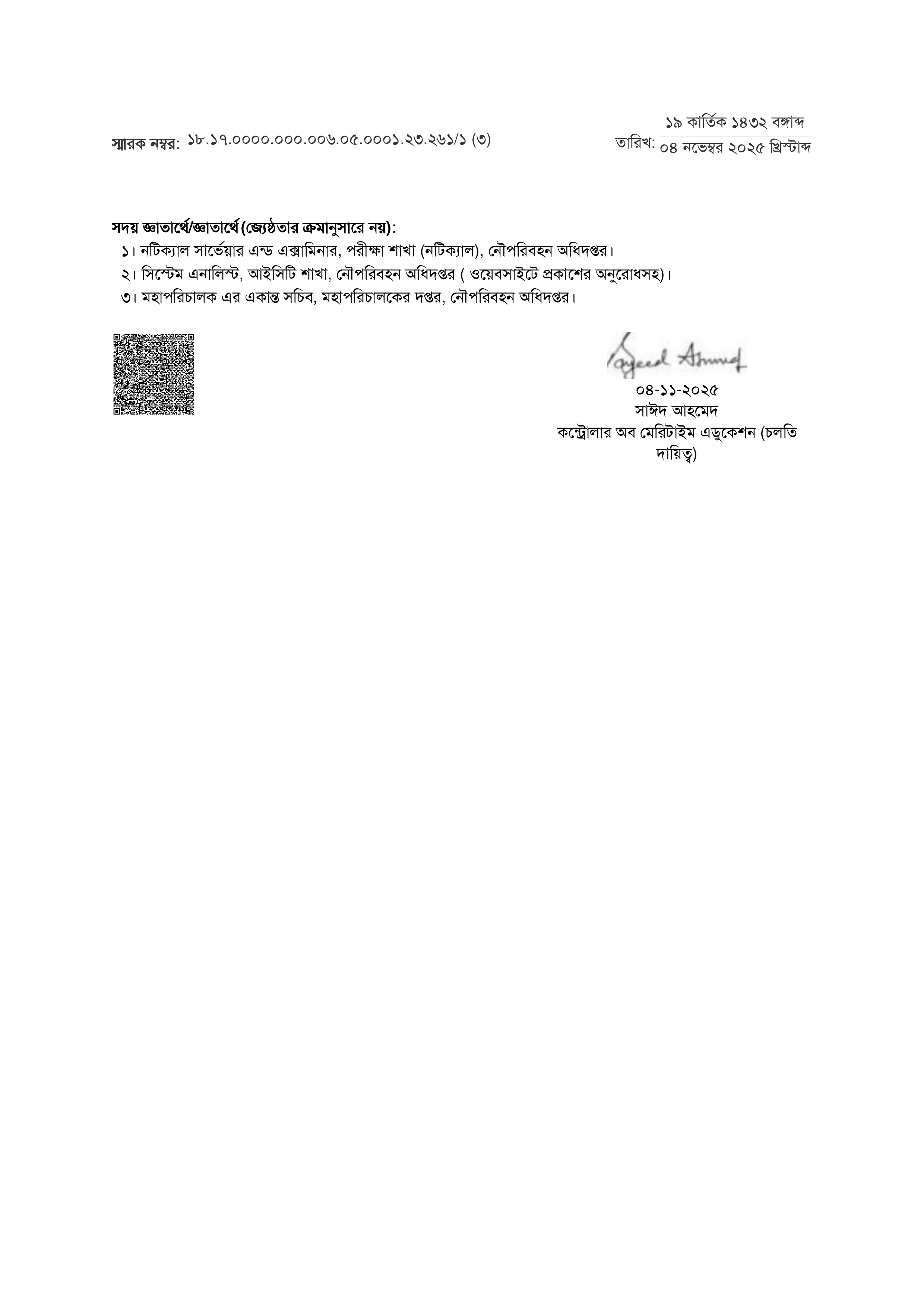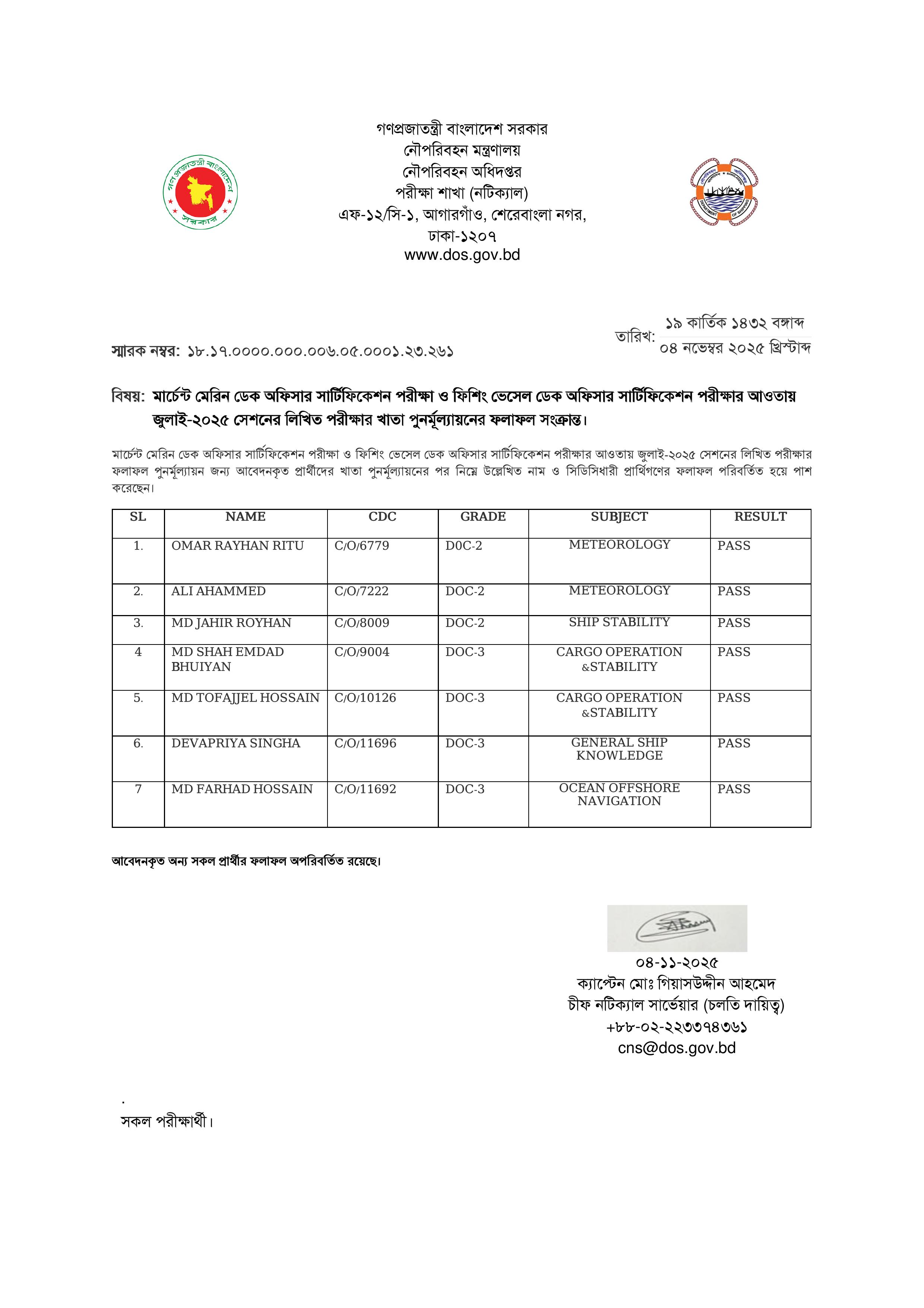নৌপরিবহন অধিদপ্তর মার্চেন্ট মেরিন ডেক অফিসার সার্টিফিকেশন পরীক্ষা এবং ফিশিং ভেসেল ডেক অফিসার সার্টিফিকেশন পরীক্ষার জুলাই-২০২৫ সেশনের লিখিত পরীক্ষার খাতা পুনর্মূল্যায়নের ফলাফল প্রকাশ করেছে।
