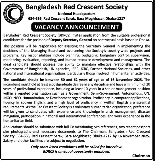 - নিয়োগকারী সংস্থা: বাংলাদেশ রেড ক্রিসেন্ট সোসাইটি একটি সমান সুযোগ প্রদানকারী নিয়োগকর্তা (Equal opportunity employer)।