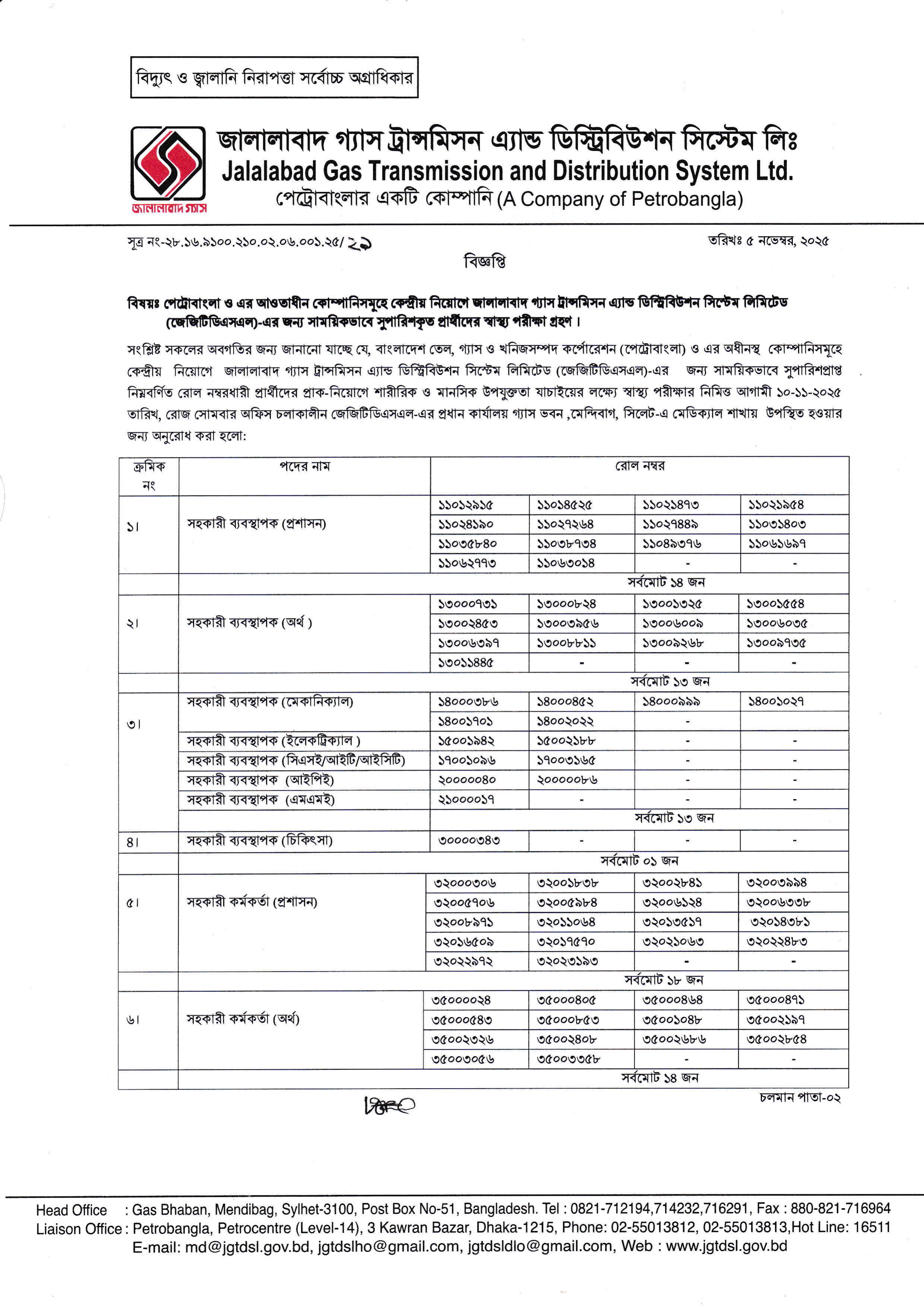 বাংলাদেশ তেল, গ্যাস ও খনিজসম্পদ কর্পোরেশন (পেট্রোবাংলা) এবং এর অধীনস্থ জালালাবাদ গ্যাস ট্রান্সমিসন অ্যান্ড ডিস্ট্রিবিউশন সিস্টেম লিমিটেড (জেজিটিডিএসএল)-এর কেন্দ্রীয় নিয়োগে সাময়িকভাবে সুপারিশপ্রাপ্ত প্রার্থীদের শারীরিক ও মানসিক উপযুক্ততা যাচাইয়ের লক্ষ্যে স্বাস্থ্য পরীক্ষা গ্রহণের বিজ্ঞপ্তি প্রকাশ করা হয়েছে।