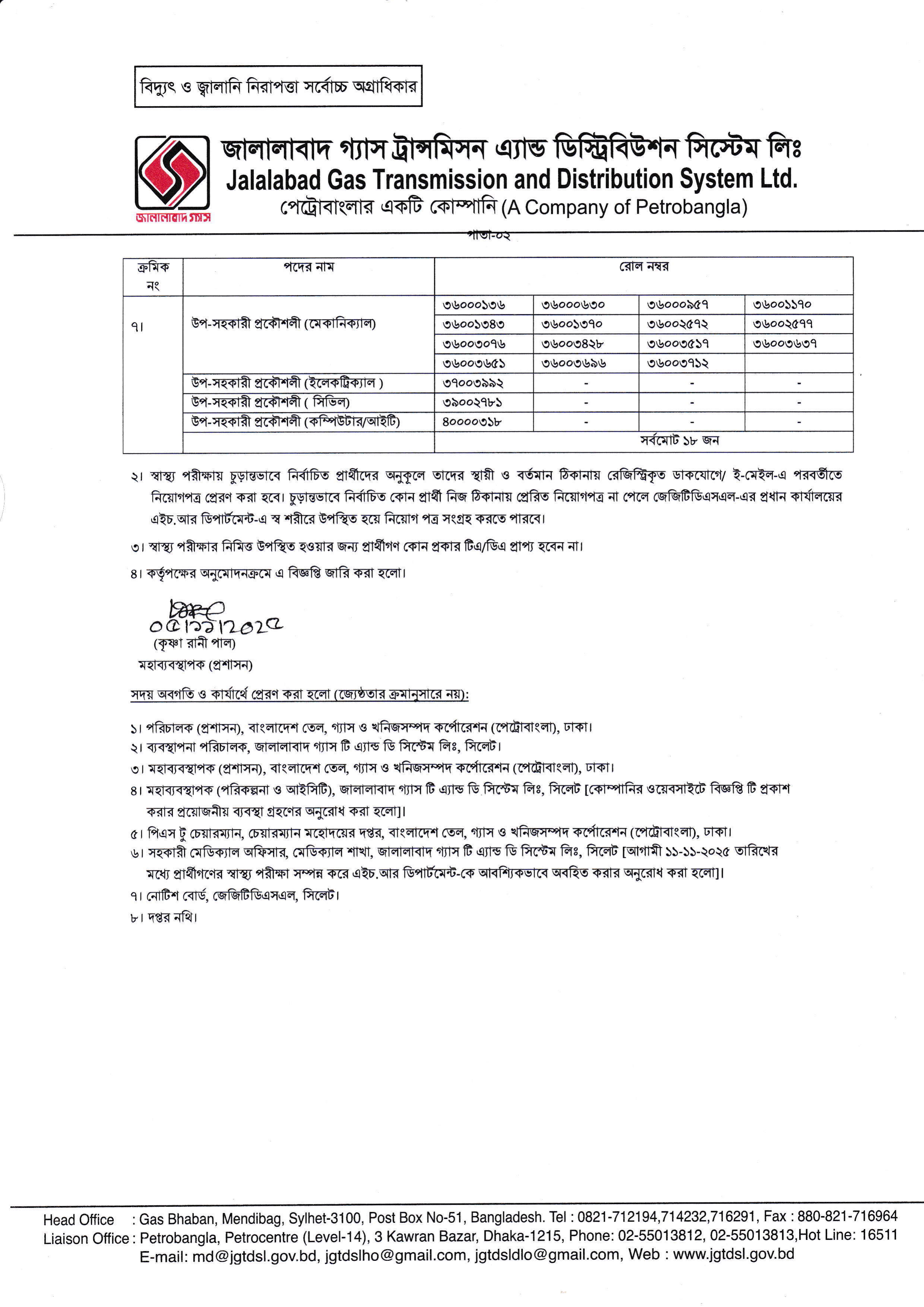স্বাস্থ্য পরীক্ষা আগামী ১০-১১-২০২৫ তারিখ, রোজ সোমবার অফিস চলাকালীন সময়ে অনুষ্ঠিত হবে। প্রার্থীদের জেজিটিডিএসএল-এর প্রধান কার্যালয়, গ্যাস ভবন, মেন্দিবাগ, সিলেট-এ অবস্থিত মেডিক্যাল শাখায় উপস্থিত হতে অনুরোধ করা হয়েছে।