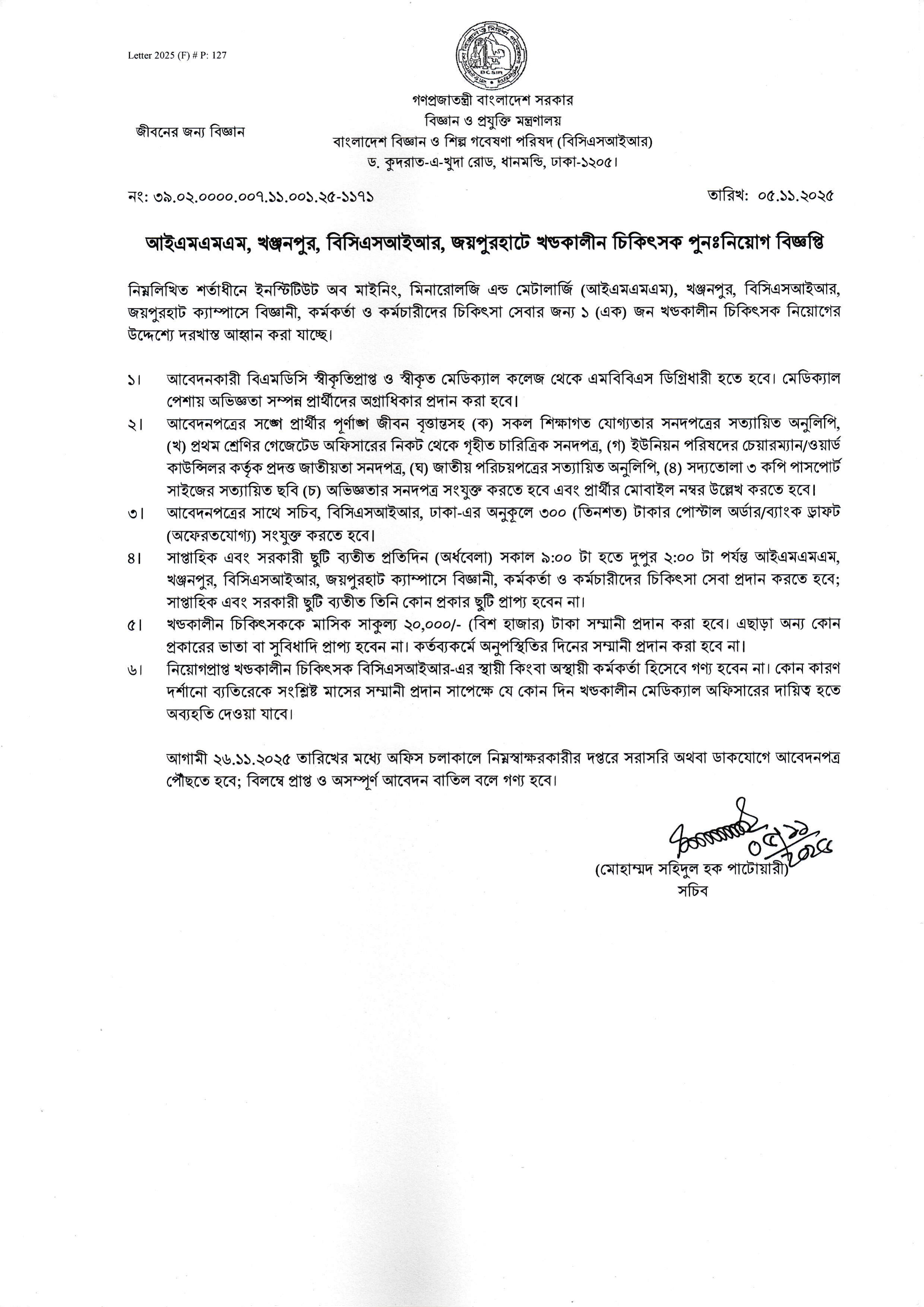 আবেদনের শেষ তারিখ: আগ্রহী প্রার্থীদের ২৬.১১.২০২৫ তারিখের মধ্যে অফিস চলাকালীন নিম্নস্বাক্ষরকারীর দপ্তরে (সচিব, বিসিএসআইআর, ঢাকা) সরাসরি অথবা ডাকযোগে আবেদনপত্র পৌঁছাতে হবে।
