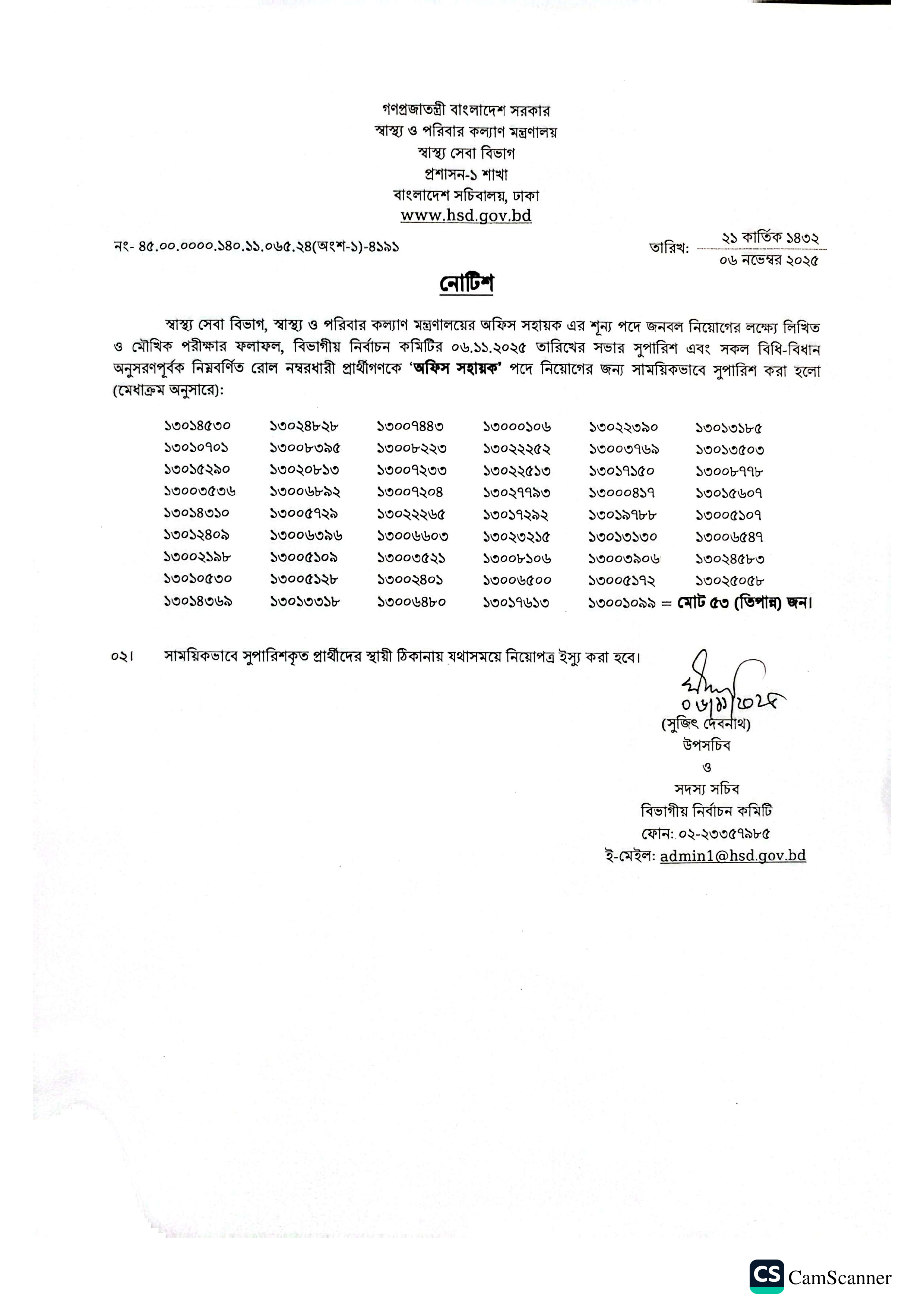 বিভাগীয় নির্বাচন কমিটির সুপারিশ এবং সকল বিধি-বিধান অনুসরণপূর্বক ৫৩ (তিপান্ন) জন প্রার্থীকে "অফিস সহায়ক" পদে নিয়োগের জন্য সাময়িকভাবে সুপারিশ করা হয়েছে।
