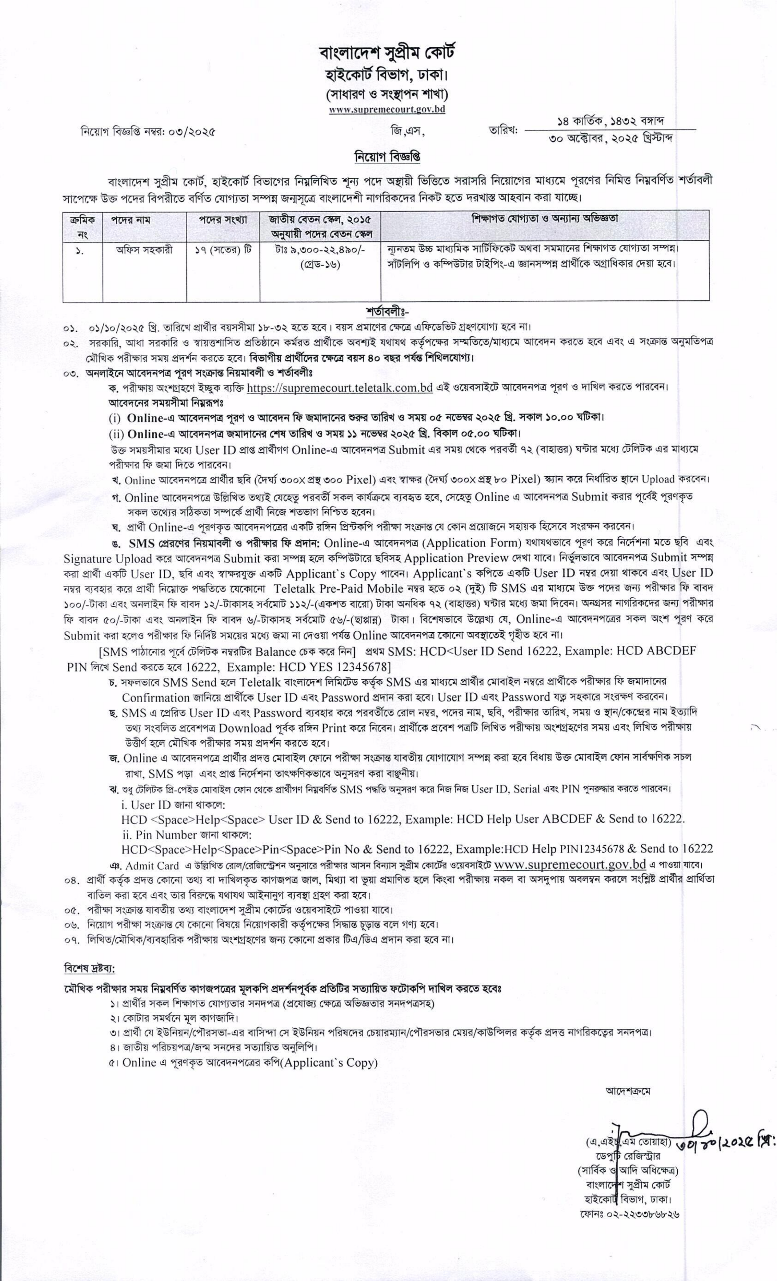 আবেদনের প্রক্রিয়া: আগ্রহী প্রার্থীদের অনলাইনে https://supremecourt.teletalk.com.bd/hcd_2025/ ওয়েবসাইটের মাধ্যমে আবেদনপত্র পূরণ ও দাখিল করতে হবে।