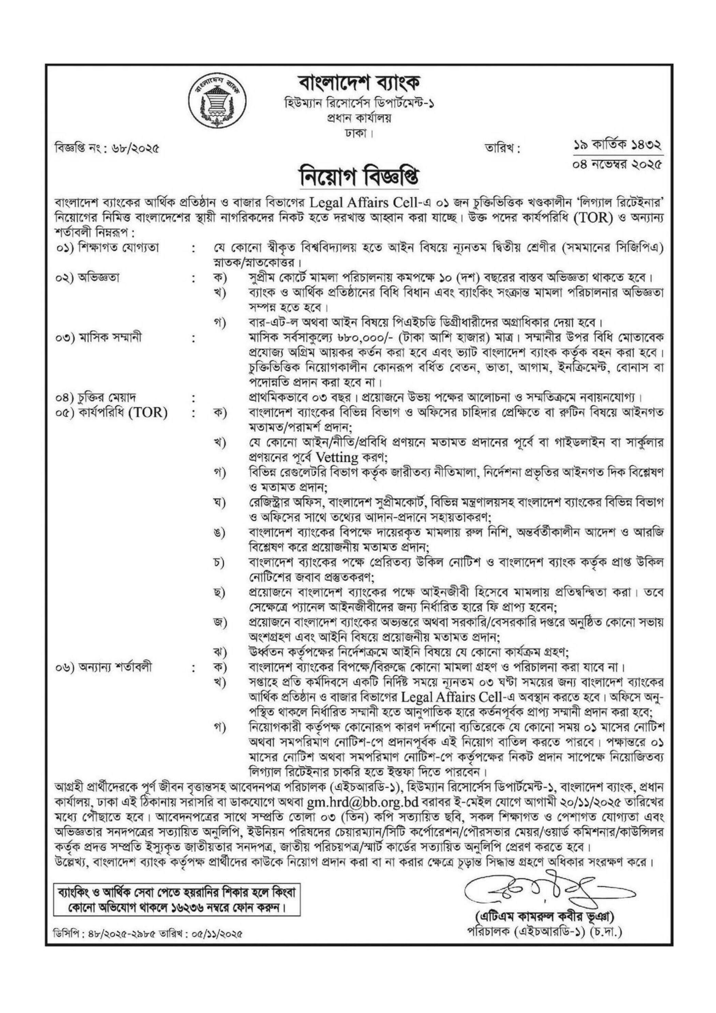 বাংলাদেশ ব্যাংকের আর্থিক প্রতিষ্ঠান ও বাজার বিভাগে ১টি চুক্তিভিত্তিক খণ্ডকালীন "লিগ্যাল রিটেইনার" পদে নিয়োগের জন্য আবেদন আহ্বান করা হয়েছে।