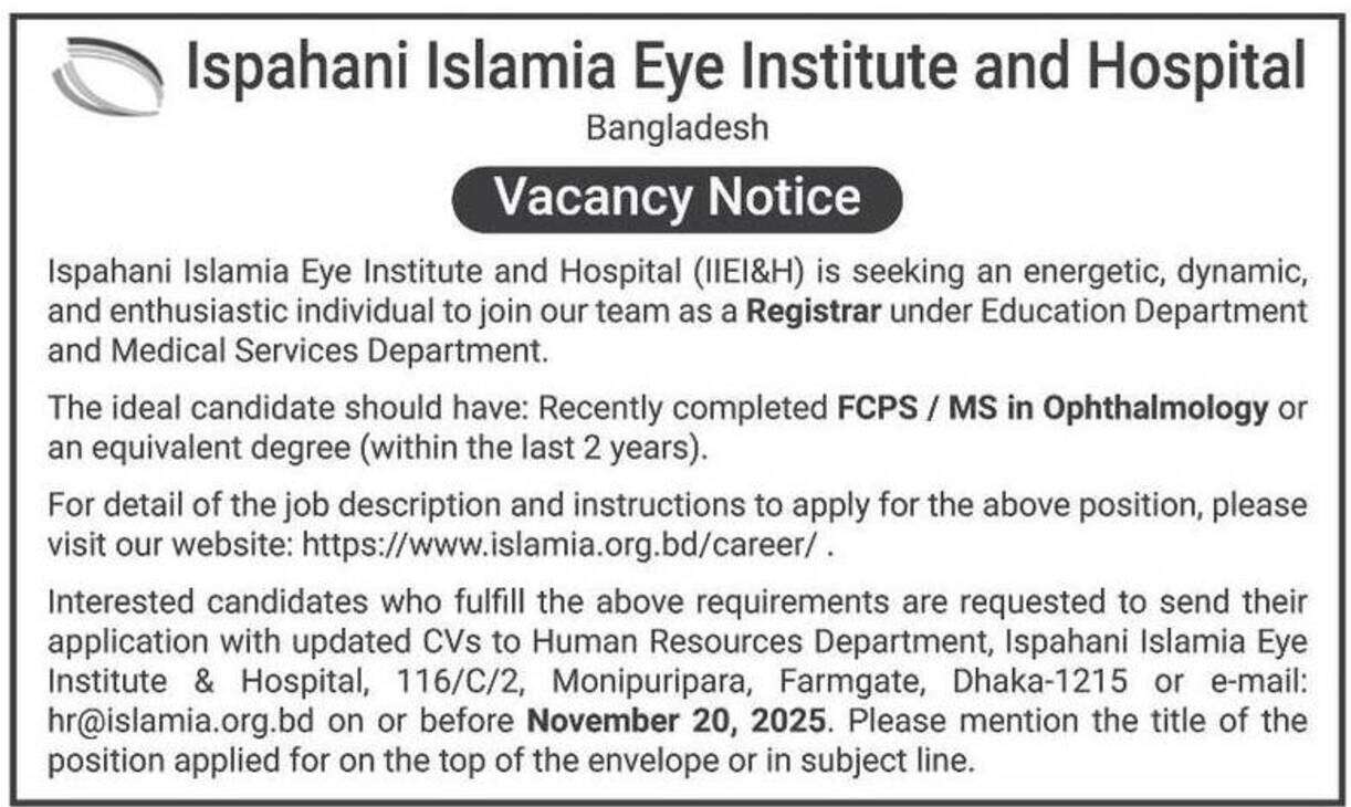 দেশের অন্যতম শীর্ষস্থানীয় চক্ষু সেবা প্রদানকারী প্রতিষ্ঠান, ইস্পাহানি ইসলামিয়া চক্ষু ইনস্টিটিউট ও হাসপাতাল (IIEI&H), তাদের শিক্ষা ও চিকিৎসা সেবা বিভাগে যোগদানের জন্য একজন উদ্যমী, গতিশীল এবং অভিজ্ঞতাসম্পন্ন প্রফেশনাল খুঁজছে। আপনি যদি চক্ষুবিজ্ঞানে একজন দক্ষ ও নিবেদিতপ্রাণ বিশেষজ্ঞ হয়ে থাকেন, তবে এই সুযোগটি আপনার জন্য।