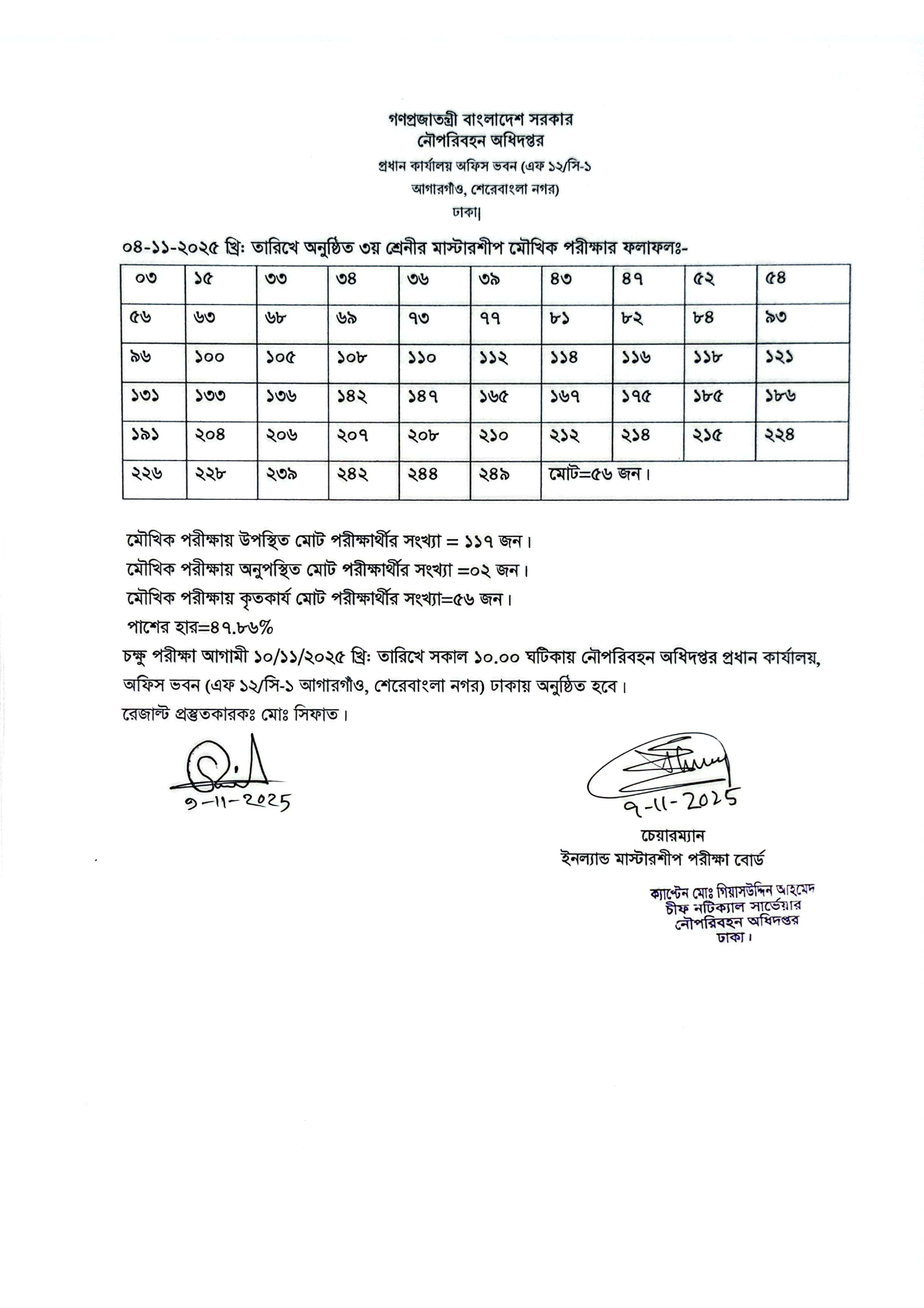 নৌপরিবহন অধিদপ্তরের মৌখিক পরীক্ষার ফলাফল প্রকাশ করা হয়েছে। প্রকাশিত ফলাফল অনুযায়ী, মোট ১১৭ জন পরীক্ষার্থীর মধ্যে ৫৬ জন কৃতকার্য হয়েছেন। পরীক্ষার পাশের হার ছিল ৪৭.৮৬%।