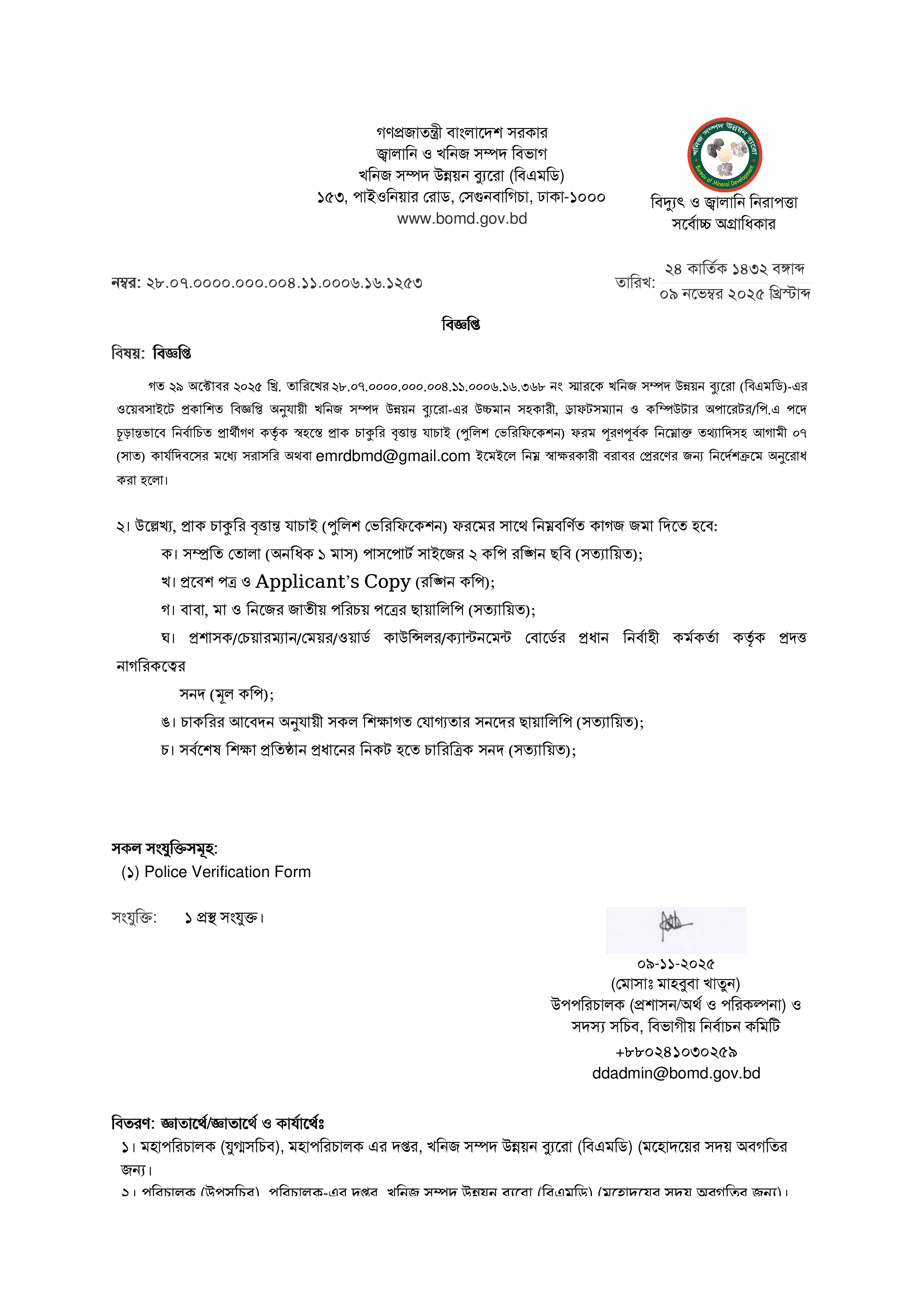 খনিজ সম্পদ উন্নয়ন ব্যুরো (বিএমডি) কর্তৃক উচ্চমান সহকারী, ড্রাফটসম্যান ও কম্পিউটার অপারেটর/পি.এ পদে চূড়ান্তভাবে নির্বাচিত প্রার্থীদের জন্য একটি জরুরি বিজ্ঞপ্তি প্রকাশ করা হয়েছে। বিজ্ঞপ্তি অনুযায়ী, নির্বাচিত সকল প্রার্থীকে স্বহস্তে পূরণকৃত প্রাক চাকুরি বৃত্তান্ত যাচাই (পুলিশ ভেরিফিকেশন) ফরম জমা দিতে হবে।