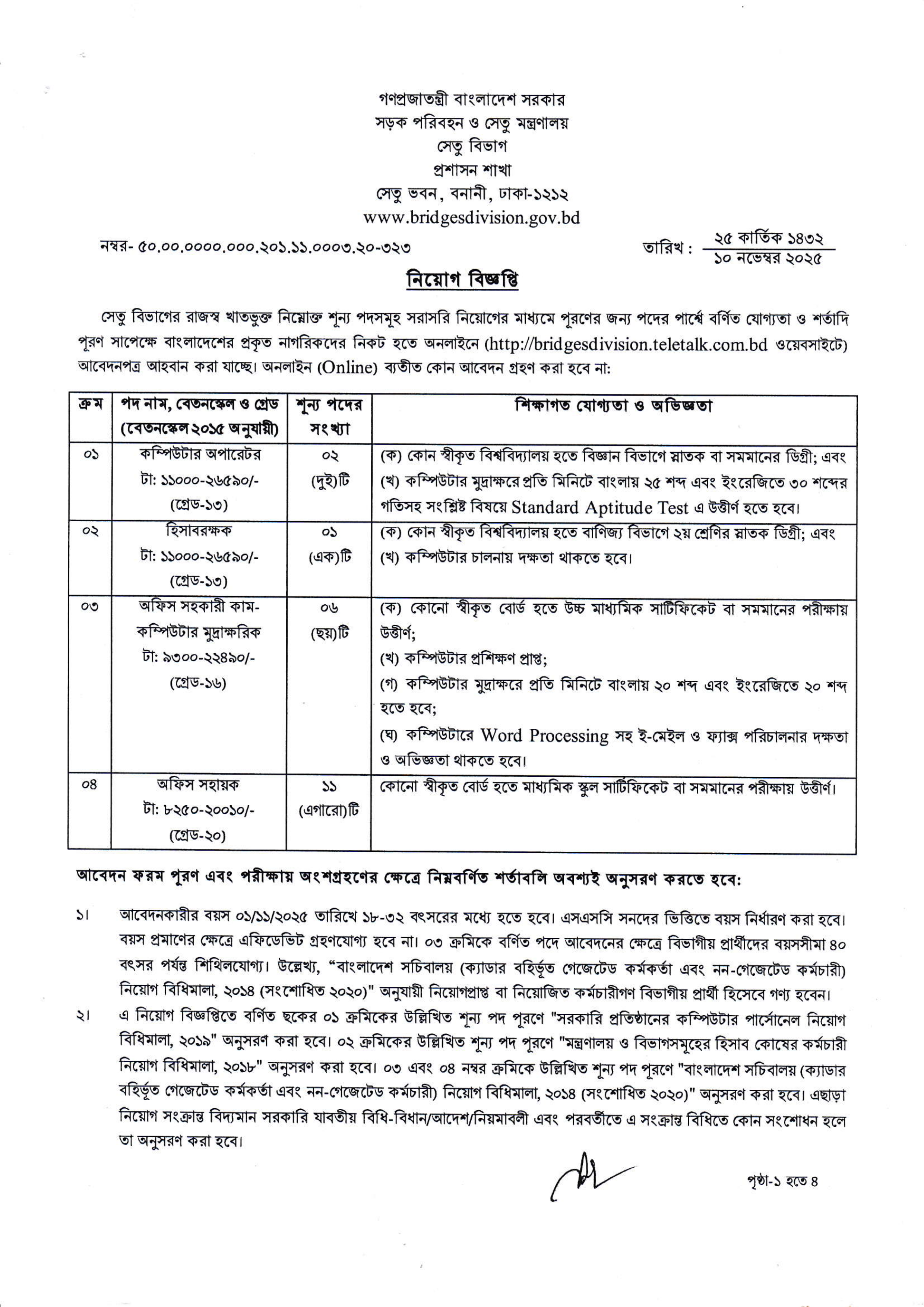 সড়ক পরিবহন ও সেতু মন্ত্রণালয়ের অধীন সেতু বিভাগ তাদের রাজস্ব খাতভুক্ত নিম্নোক্ত শূন্য পদসমূহে জনবল নিয়োগের জন্য একটি বিজ্ঞপ্তি প্রকাশ করেছে। এই বিজ্ঞপ্তির মাধ্যমে মোট ২০টি পদে প্রকৃত বাংলাদেশি নাগরিকদের নিকট থেকে অনলাইনে আবেদন আহ্বান করা হয়েছে।