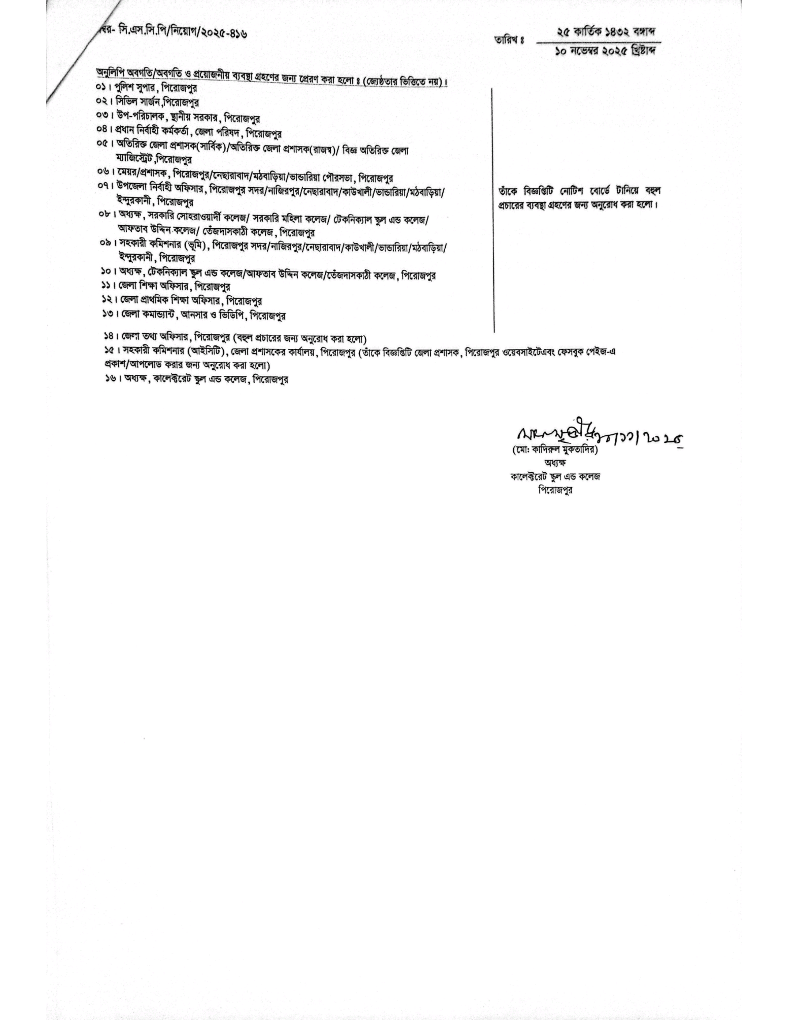 আবেদনের শেষ তারিখ: আগামী ৩০/১১/২০২৫ ইং তারিখের মধ্যে অফিস চলাকালীন বিকেল ০৫:০০ মিনিটের মধ্যে সভাপতি, কালেক্টরেট স্কুল এন্ড কলেজ, পিরোজপুর বরাবর ডাকযোগে/সরাসরি আবেদনপত্র পৌঁছাতে হবে।