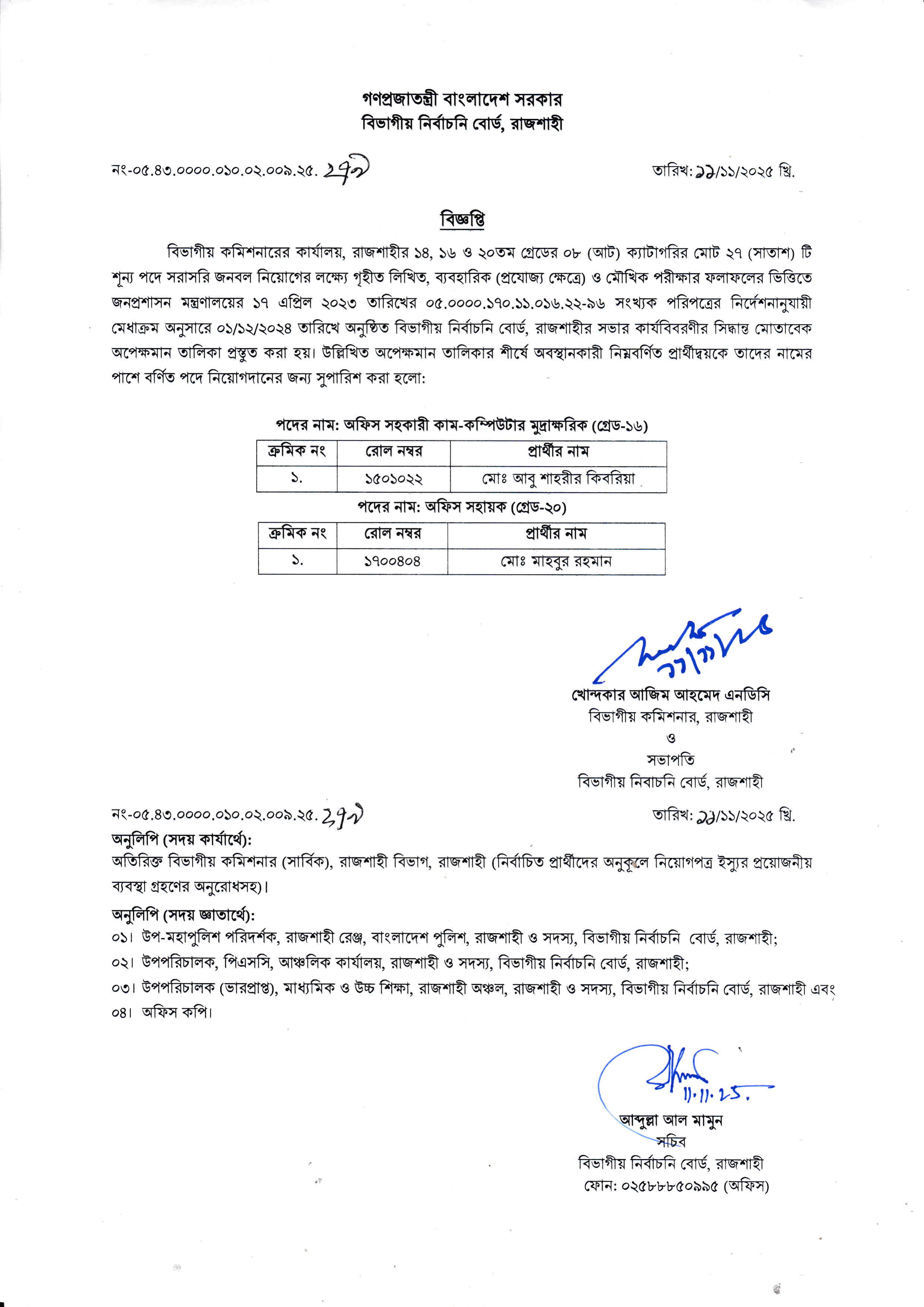 বিভাগীয় কমিশনারের কার্যালয়, রাজশাহীর ১৪, ১৬ ও ২০তম গ্রেডের ০৮টি ক্যাটাগরির মোট ২৭টি শূন্য পদে সরাসরি জনবল নিয়োগের লক্ষ্যে গৃহীত লিখিত, ব্যবহারিক (প্রযোজ্য ক্ষেত্রে) ও মৌখিক পরীক্ষার ফলাফলের ভিত্তিতে একটি অপেক্ষমান তালিকা প্রস্তুত করা হয়েছিল।