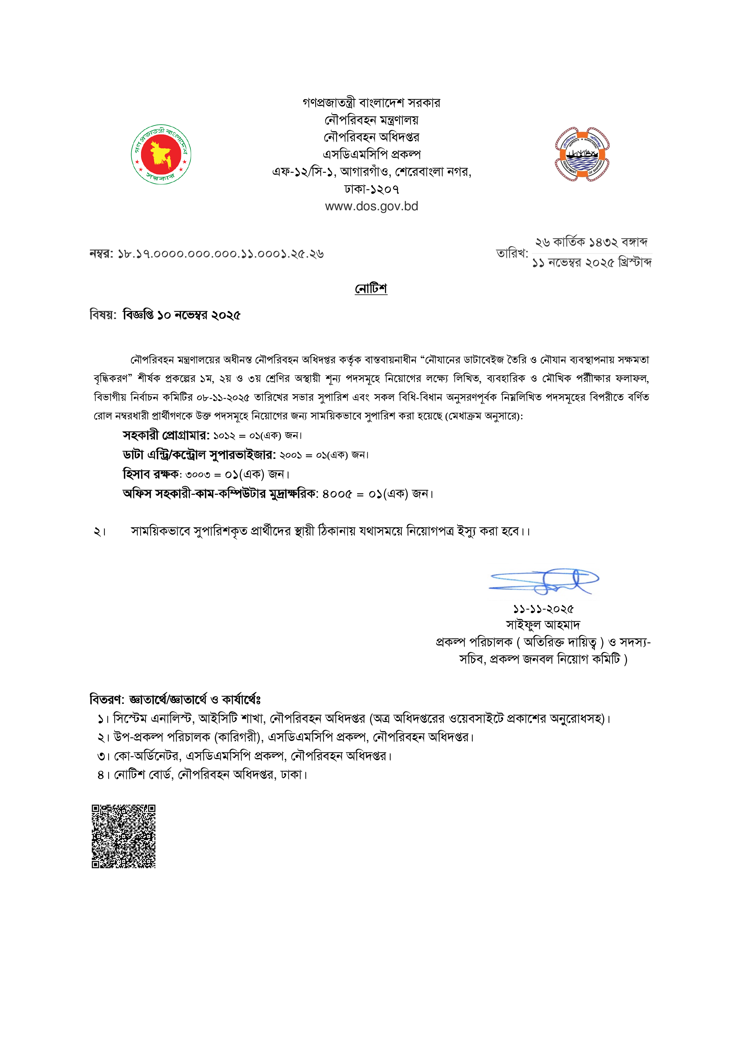 নৌপরিবহন মন্ত্রণালয়ের অধীনস্থ নৌপরিবহন অধিদপ্তরের বাস্তবায়নাধীন “নৌযানের ডাটাবেইজ তৈরি ও নৌযান ব্যবস্থাপনায় সক্ষমতা বৃদ্ধিকরণ” শীর্ষক প্রকল্পের ১ম, ২য় ও ৩য় শ্রেণির অস্থায়ী শূন্য পদসমূহে নিয়োগের লক্ষ্যে লিখিত, ব্যবহারিক ও মৌখিক পরীক্ষার ফলাফল প্রকাশিত হয়েছে। ০৮-১১-২০২৫ তারিখে অনুষ্ঠিত বিভাগীয় নির্বাচন কমিটির সভার সুপারিশ এবং সকল বিধি-বিধান অনুসরণ করে নিম্নলিখিত পদসমূহে প্রার্থীদের সাময়িকভাবে সুপারিশ করা হয়েছে: