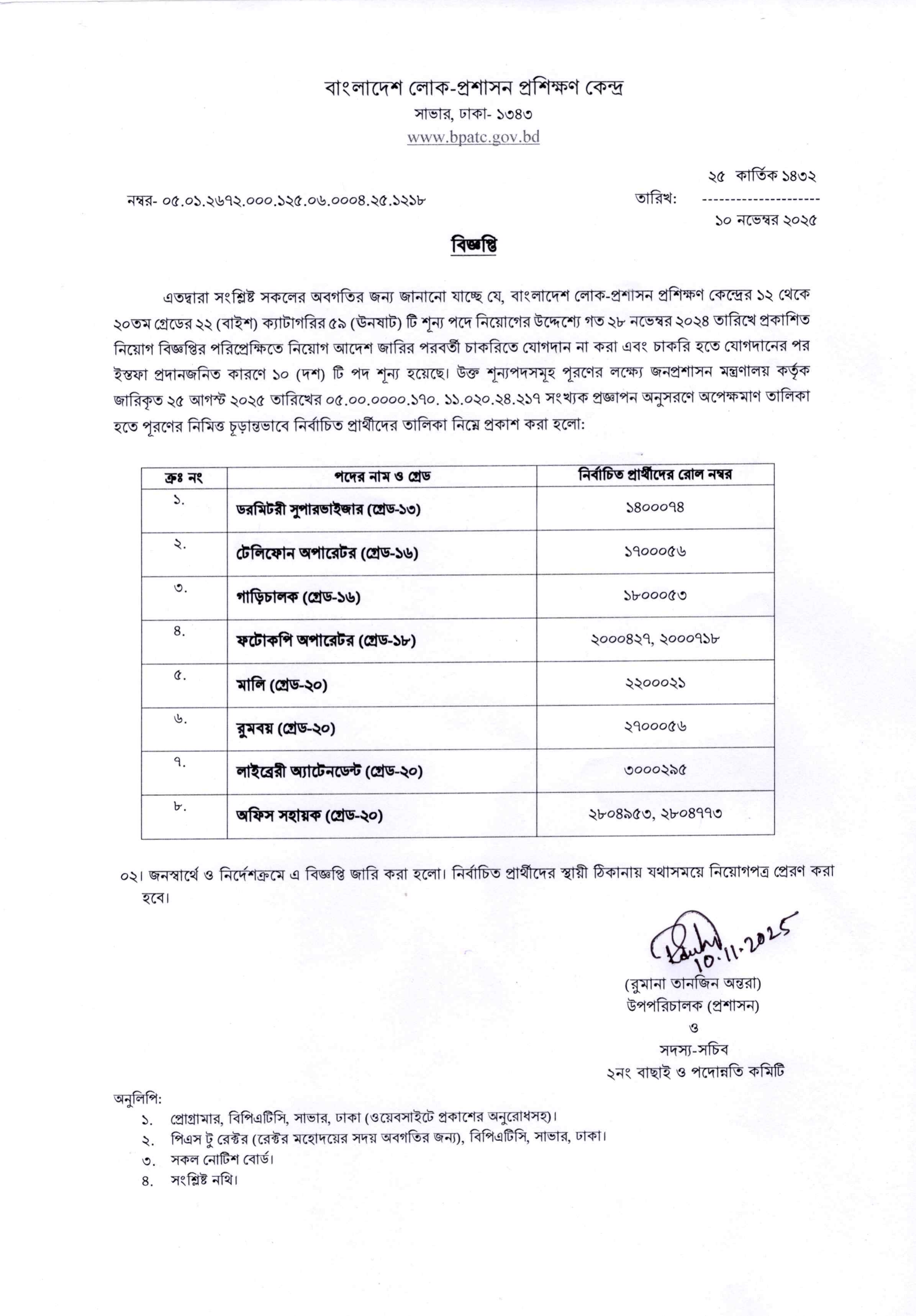 বাংলাদেশ লোক-প্রশাসন প্রশিক্ষণ কেন্দ্র (বিপিএটিসি) তাদের ২২ ক্যাটাগরির ১২ থেকে ২০তম গ্রেডের শূন্য পদে অপেক্ষমাণ তালিকা থেকে চূড়ান্তভাবে নির্বাচিত প্রার্থীদের তালিকা প্রকাশ করেছে। পূর্বে ২৮ নভেম্বর ২০২৪ তারিখে প্রকাশিত নিয়োগ বিজ্ঞপ্তির পরিপ্রেক্ষিতে নিয়োগপ্রাপ্তদের মধ্যে যারা যোগদান করেননি বা যোগদান করার পর ইস্তফা দিয়েছেন, সে সকল কারণে সৃষ্ট ১০টি শূন্য পদ পূরণের জন্য এই তালিকা প্রকাশ করা হয়েছে।