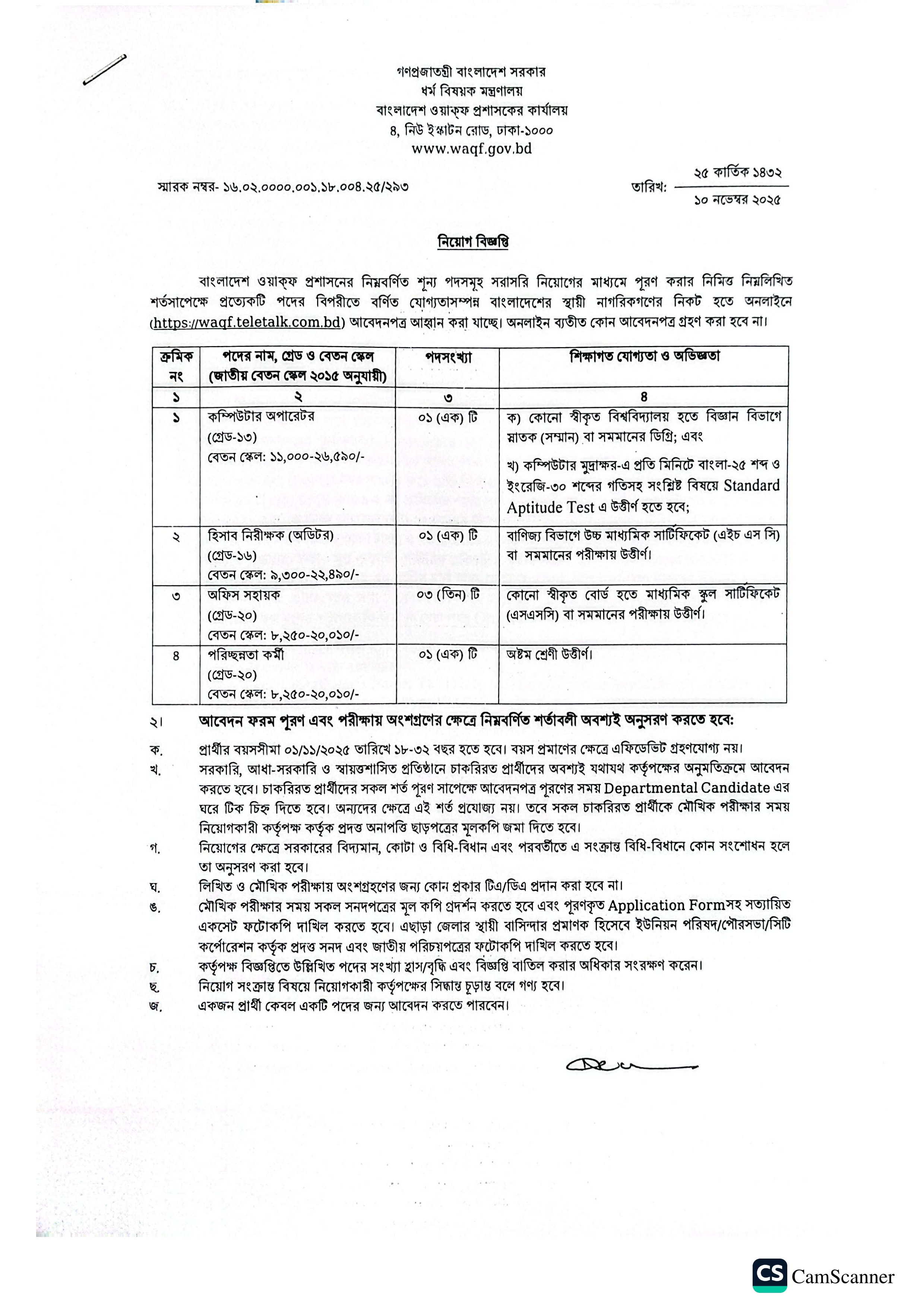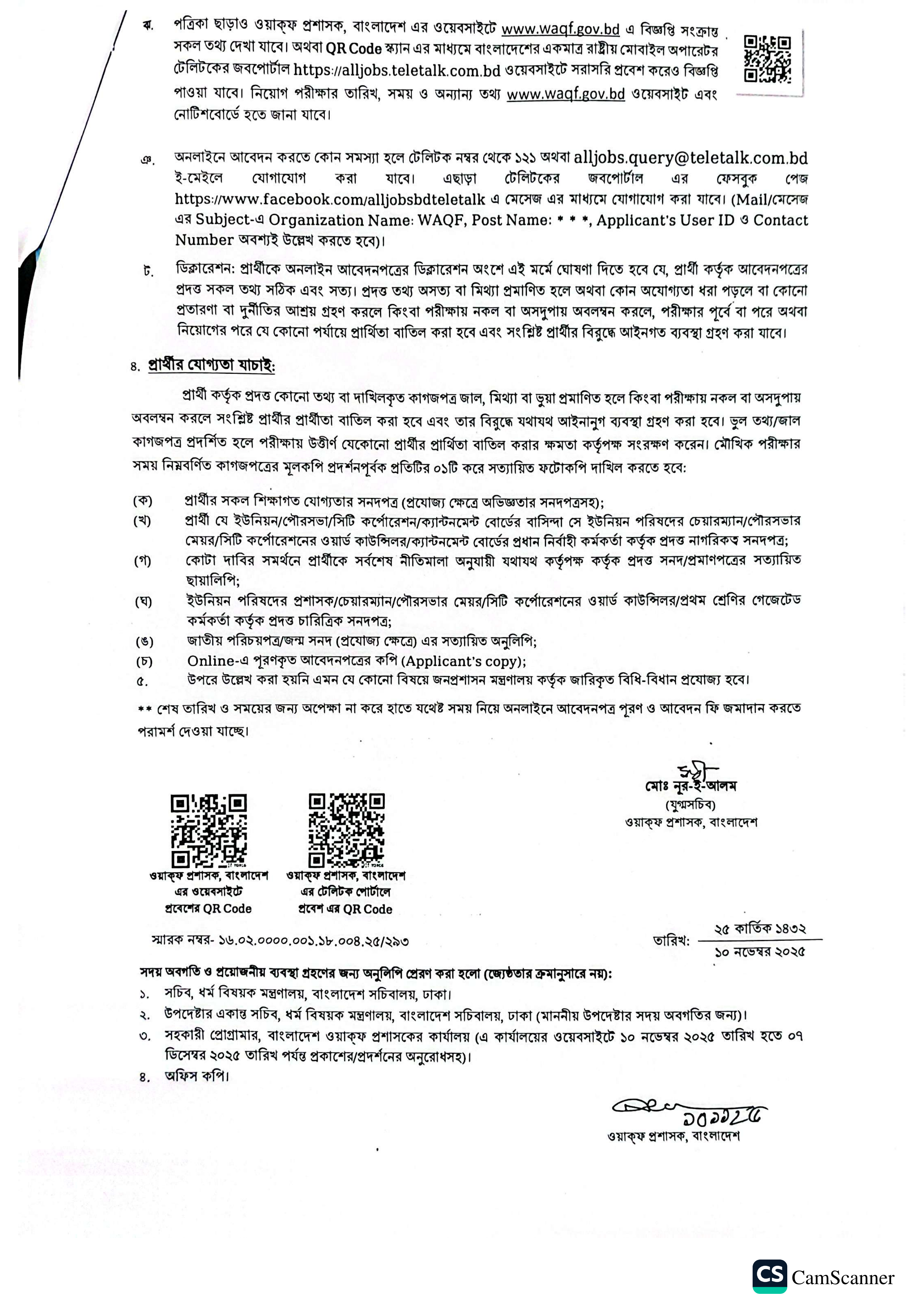 আবেদনের প্রক্রিয়া: আগ্রহী প্রার্থীরা ১৬ নভেম্বর ২০২৫ সকাল ১০:০০ টা থেকে ০৭ ডিসেম্বর ২০২৫ বিকাল ৫:০০ টা পর্যন্ত http://waqf.teletalk.com.bd ওয়েবসাইটের মাধ্যমে অনলাইনে আবেদন করতে পারবেন।