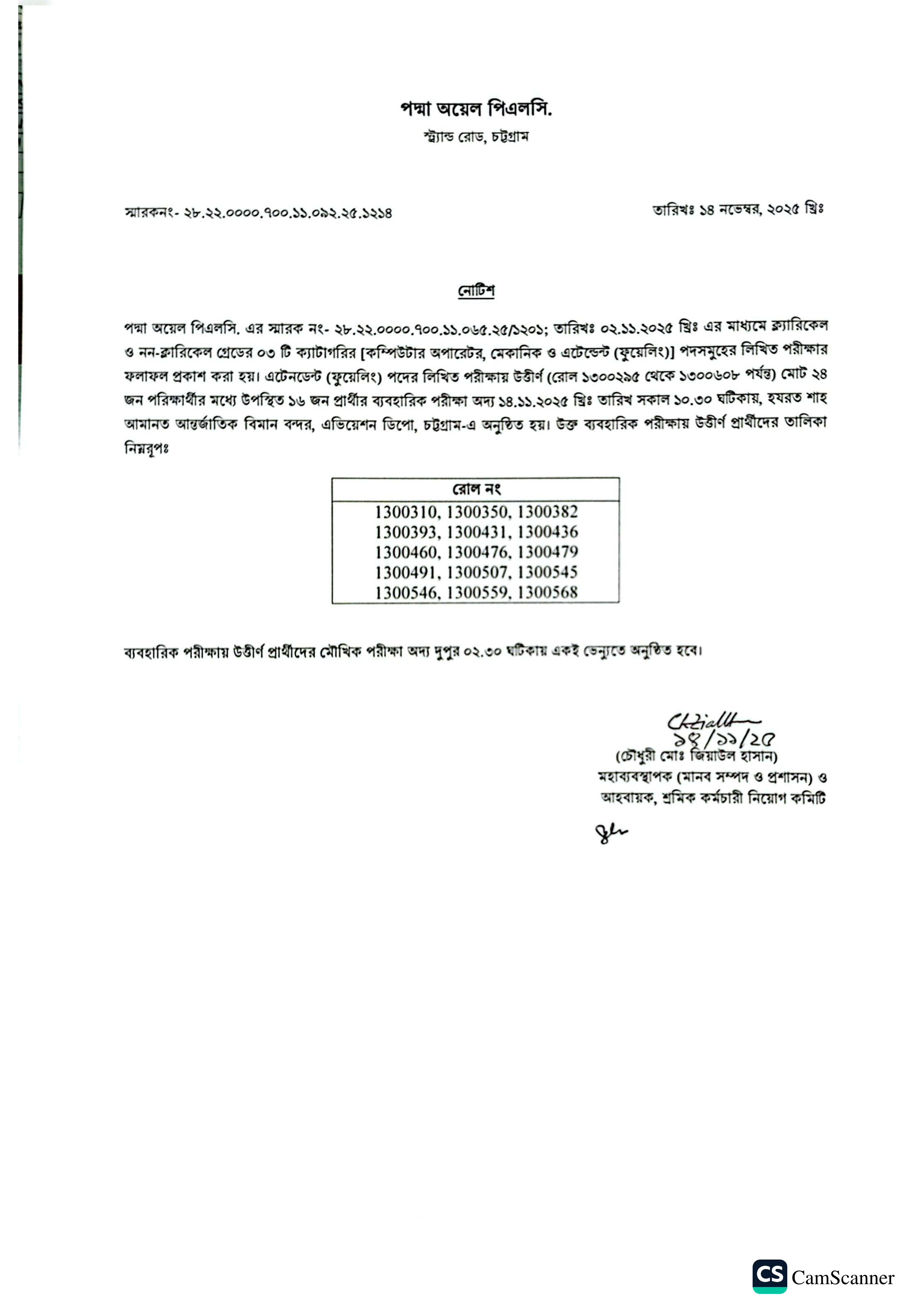 পদ্মা অয়েল পিএলসি. ক্ল্যারিকেল ও নন-ক্লারিকেল গ্রেডের বিভিন্ন পদের লিখিত পরীক্ষার ধারাবাহিকতায় এটেনডেন্ট (ফুয়েলিং) পদের ব্যবহারিক পরীক্ষার ফলাফল প্রকাশ করেছে।