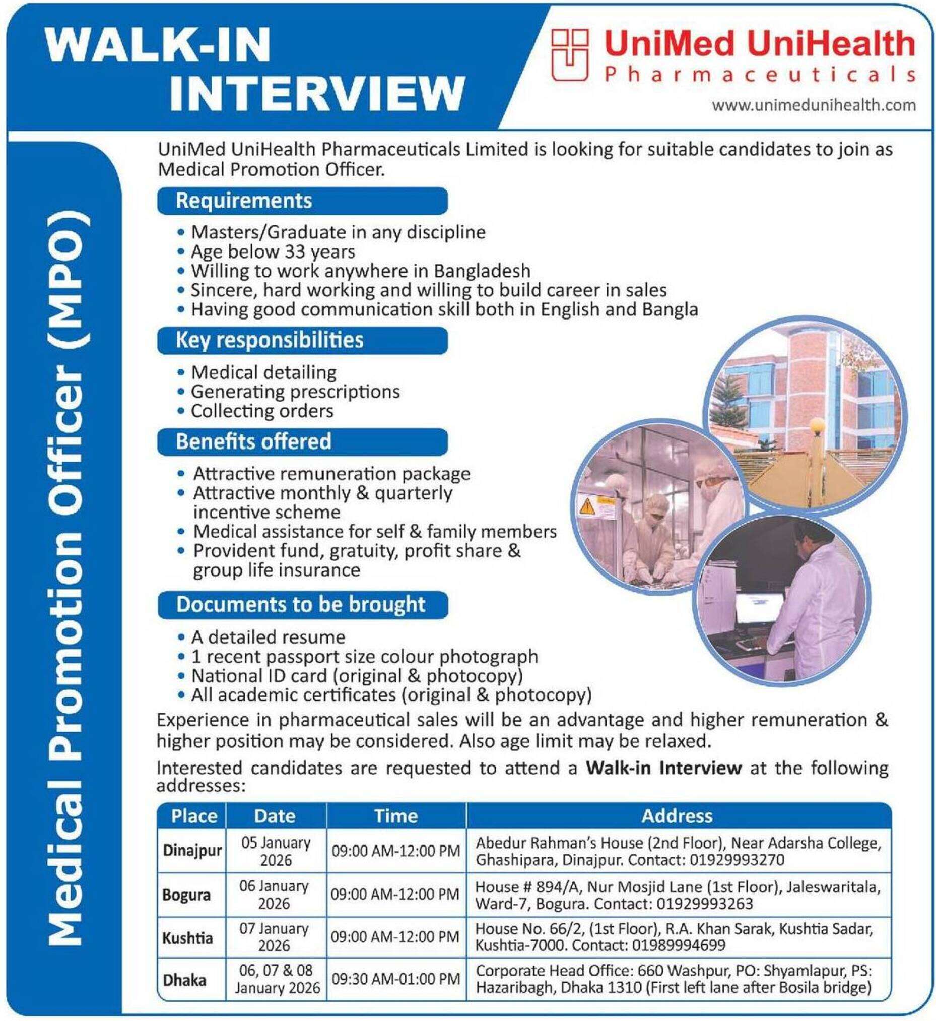 ইউনিমেড ইউনিহেলথ ফার্মাসিউটিক্যালস লিমিটেড, মেডিকেল প্রমোশন অফিসার পদে যোগদানের জন্য উপযুক্ত প্রার্থীদের খুঁজছে।