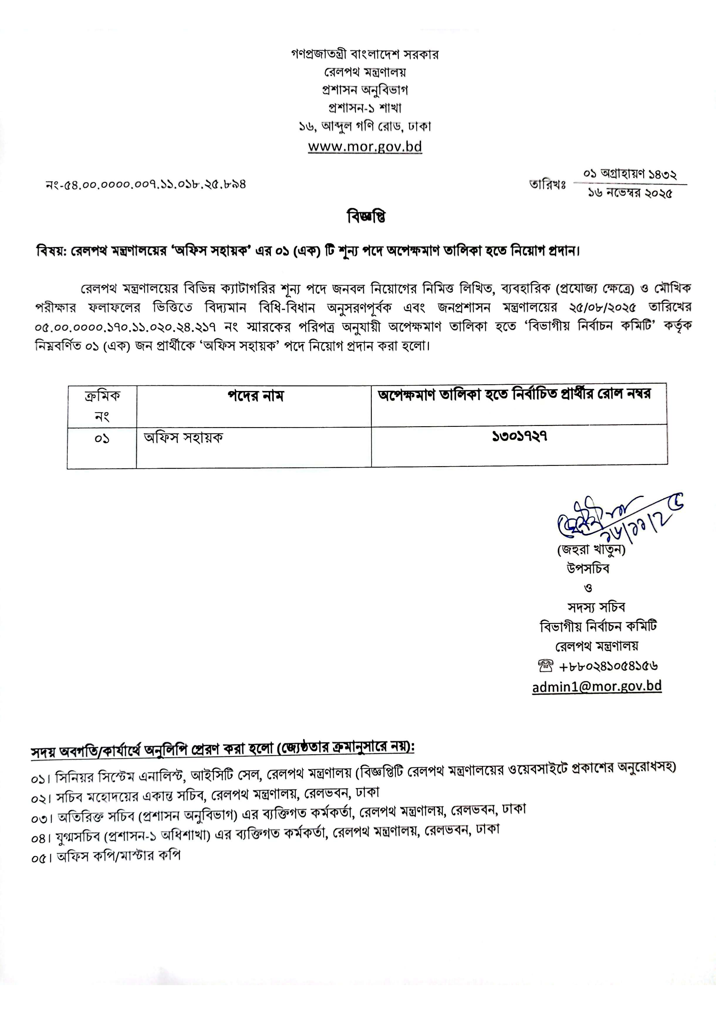 রেলপথ মন্ত্রণালয়ের 'অফিস সহায়ক' পদে অপেক্ষমাণ তালিকা হতে ১ (এক) জন প্রার্থীকে নিয়োগ প্রদান করা হয়েছে।