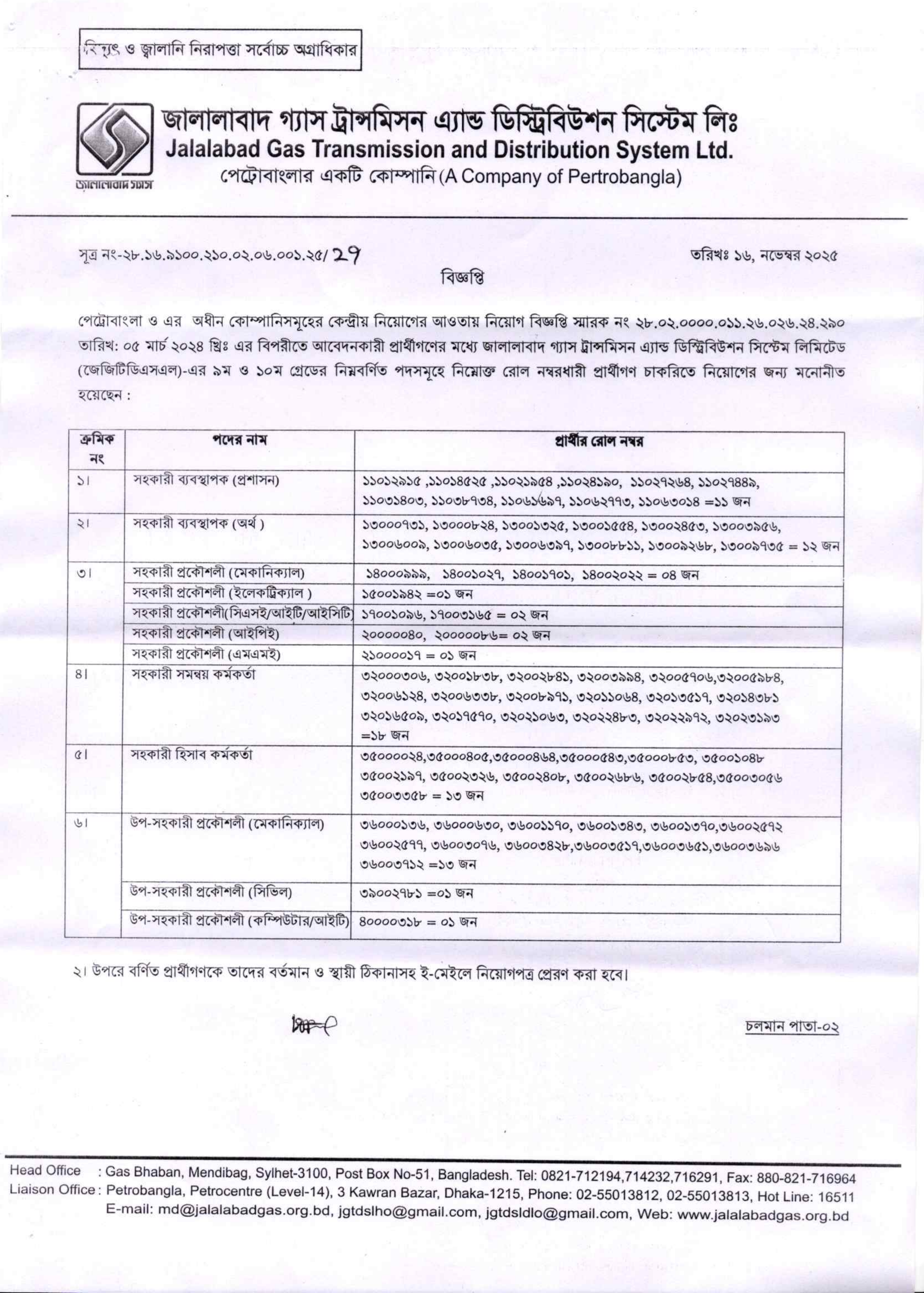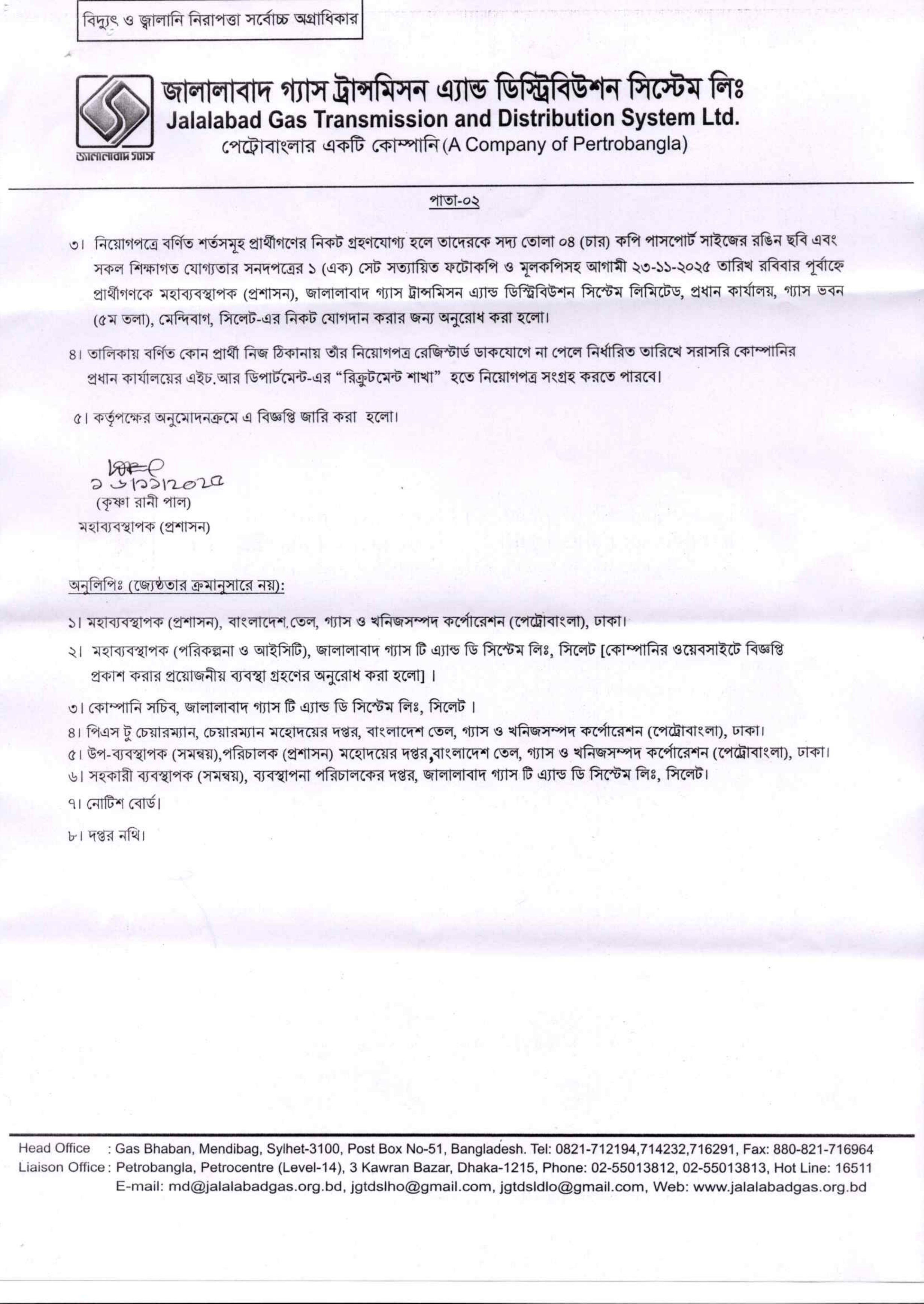 সকল নির্বাচিত প্রার্থীকে ২৩ নভেম্বর ২০২৫ তারিখ রবিবার পূর্বাহ্ন এর মধ্যে মহাব্যবস্থাপক (প্রশাসন), জালালাবাদ গ্যাস ট্রান্সমিসন এ্যান্ড ডিস্ট্রিবিউশন সিস্টেম লিমিটেড, প্রধান কার্যালয়, গ্যাস ভবন (৫ম তলা), মেন্দিবাগ, সিলেট-এর নিকট যোগদান করার জন্য অনুরোধ করা হয়েছে।
