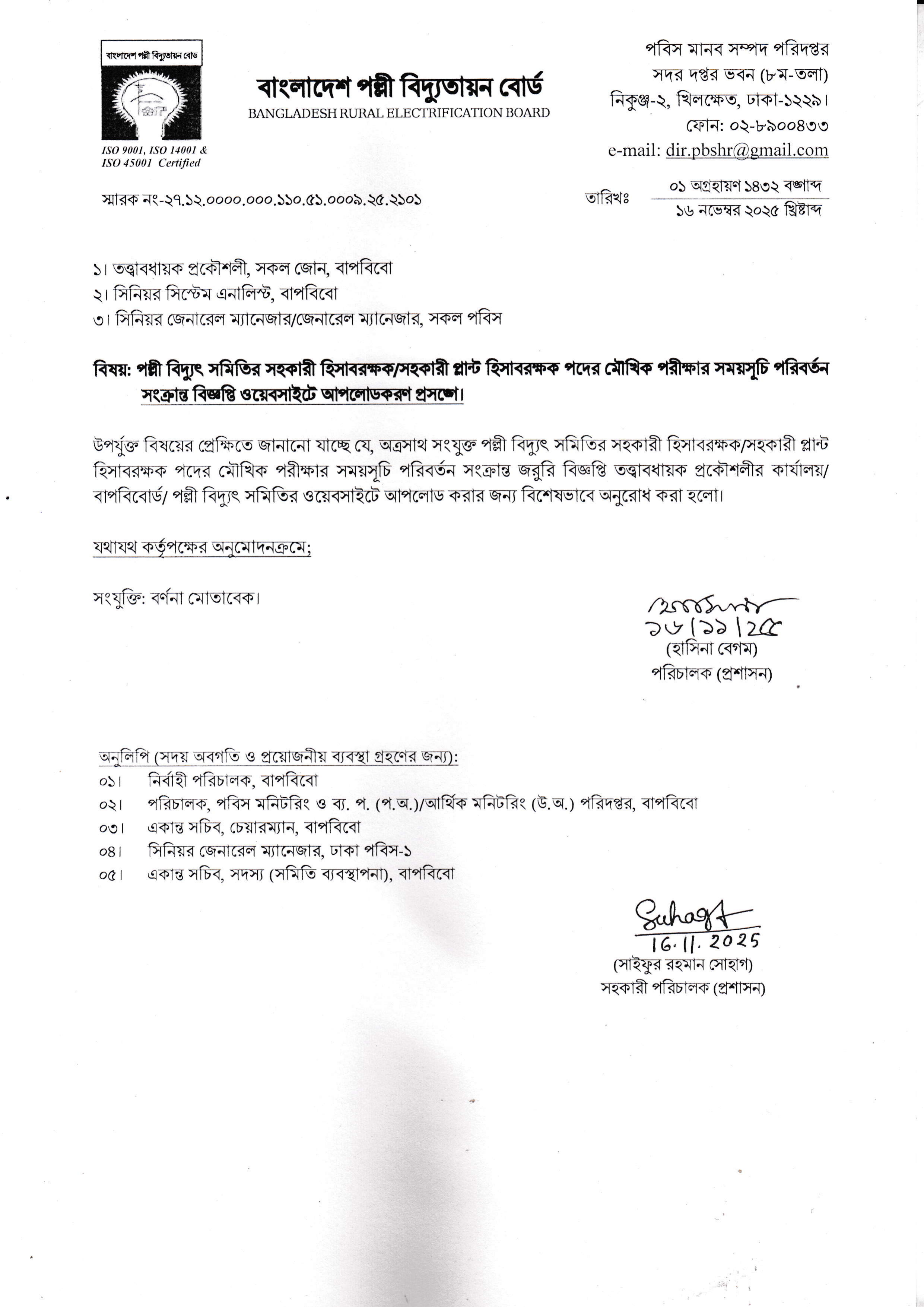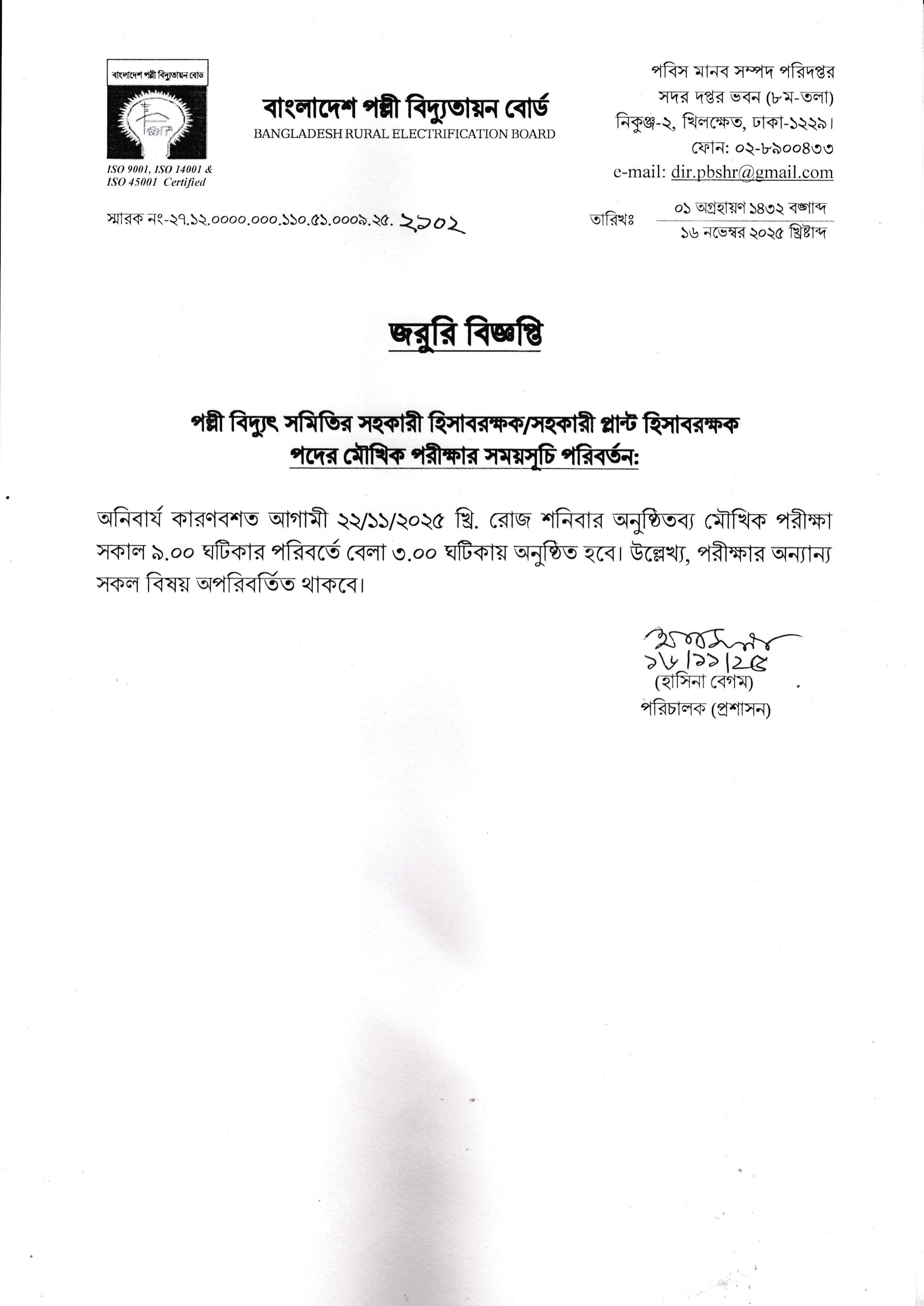 বাংলাদেশ পল্লী বিদ্যুতায়ন বোর্ডের অধীনে পল্লী বিদ্যুৎ সমিতির সহকারী হিসাবরক্ষক/সহকারী প্লান্ট হিসাবরক্ষক পদের মৌখিক পরীক্ষার সময়সূচি পরিবর্তন করা হয়েছে।