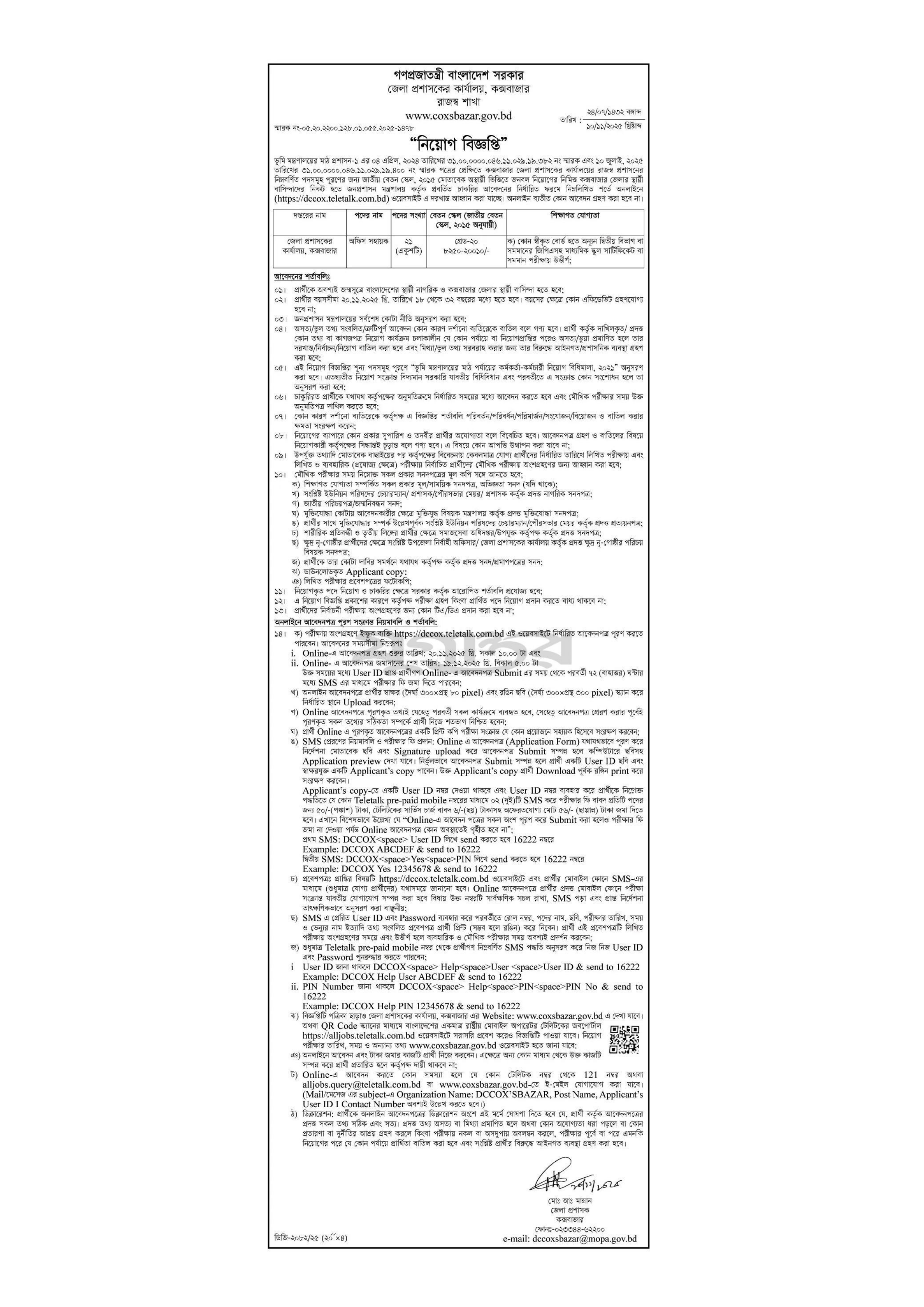 কক্সবাজার জেলা প্রশাসকের কার্যালয়ের রাজস্ব প্রশাসনে অস্থায়ী ভিত্তিতে জনবল নিয়োগের জন্য একটি বিজ্ঞপ্তি প্রকাশিত হয়েছে। আগ্রহী প্রার্থীরা অনলাইনে আবেদন করতে পারবেন।