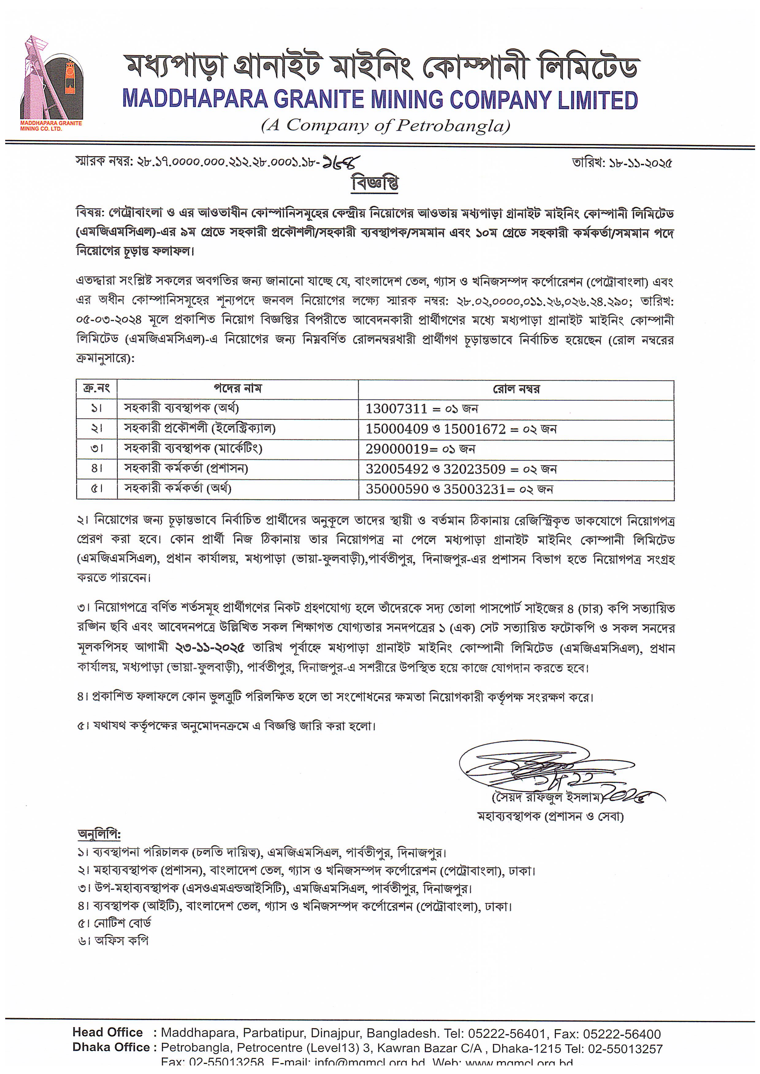 পেট্রোবাংলা ও এর আওতাধীন কোম্পানিসমূহের কেন্দ্রীয় নিয়োগের আওতায় মধ্যপাড়া গ্রানাইট মাইনিং কোম্পানী লিমিটেড (এমজিএমসিএল) এর ৯ম গ্রেডে সহকারী প্রকৌশলী/সহকারী ব্যবস্থাপক/সমমান এবং ১০ম গ্রেডে সহকারী কর্মকর্তা/সমমান পদে নিয়োগের চূড়ান্ত ফলাফল প্রকাশিত হয়েছে।