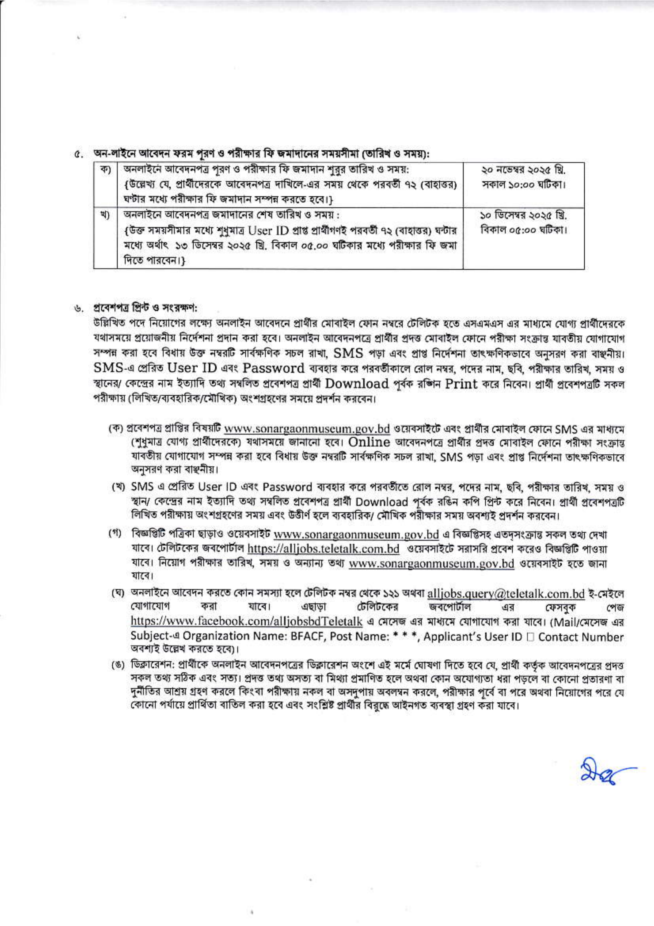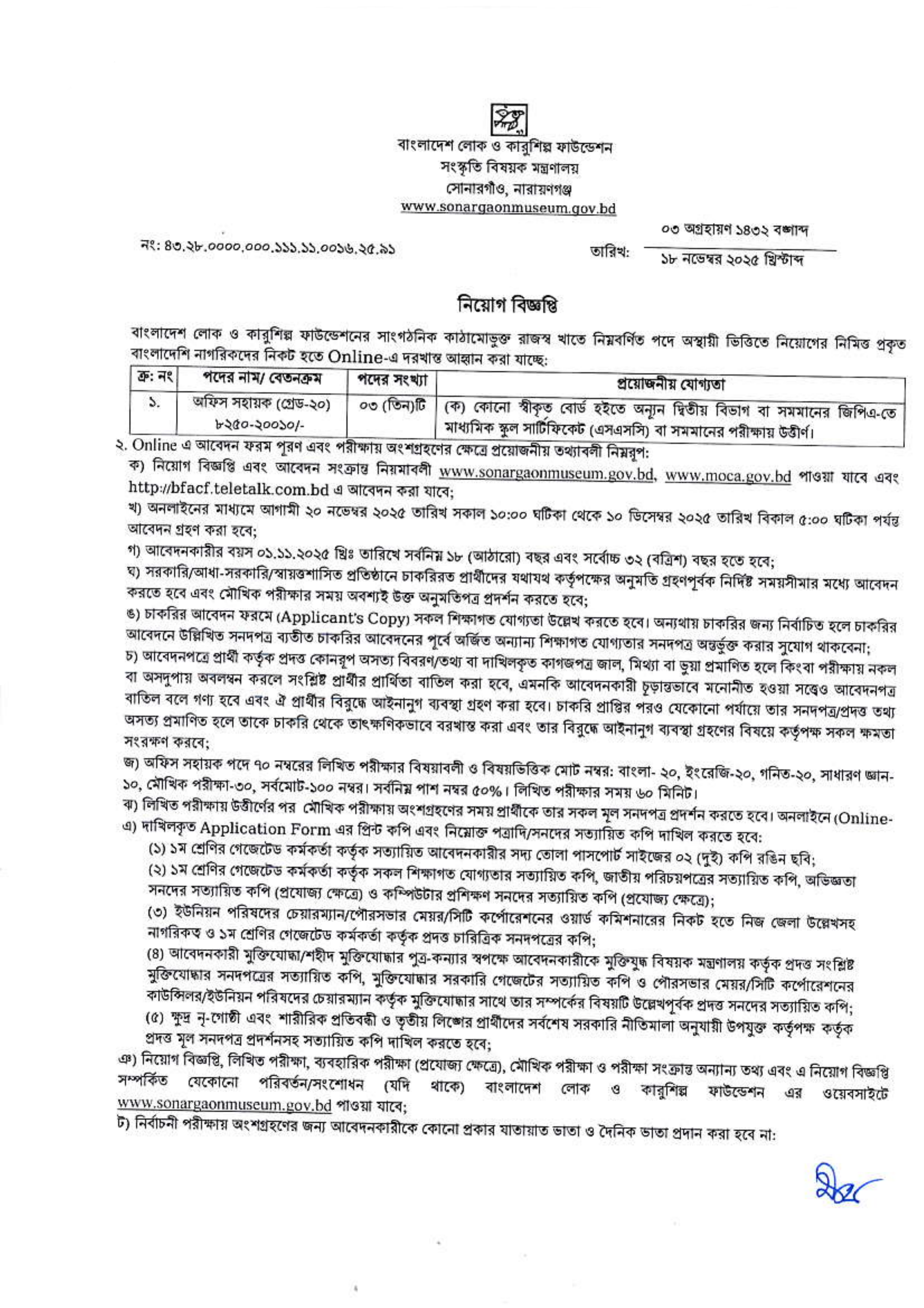 পরীক্ষার তারিখ, সময় ও স্থান: নিয়োগ পরীক্ষার তারিখ, সময় ও অন্যান্য তথ্য বাংলাদেশ লোক ও কারুশিল্প ফাউন্ডেশনের ওয়েবসাইট (www.bafacf.gov.bd) এবং প্রার্থীর মোবাইল ফোনে SMS এর মাধ্যমে যথাসময়ে জানানো হবে।