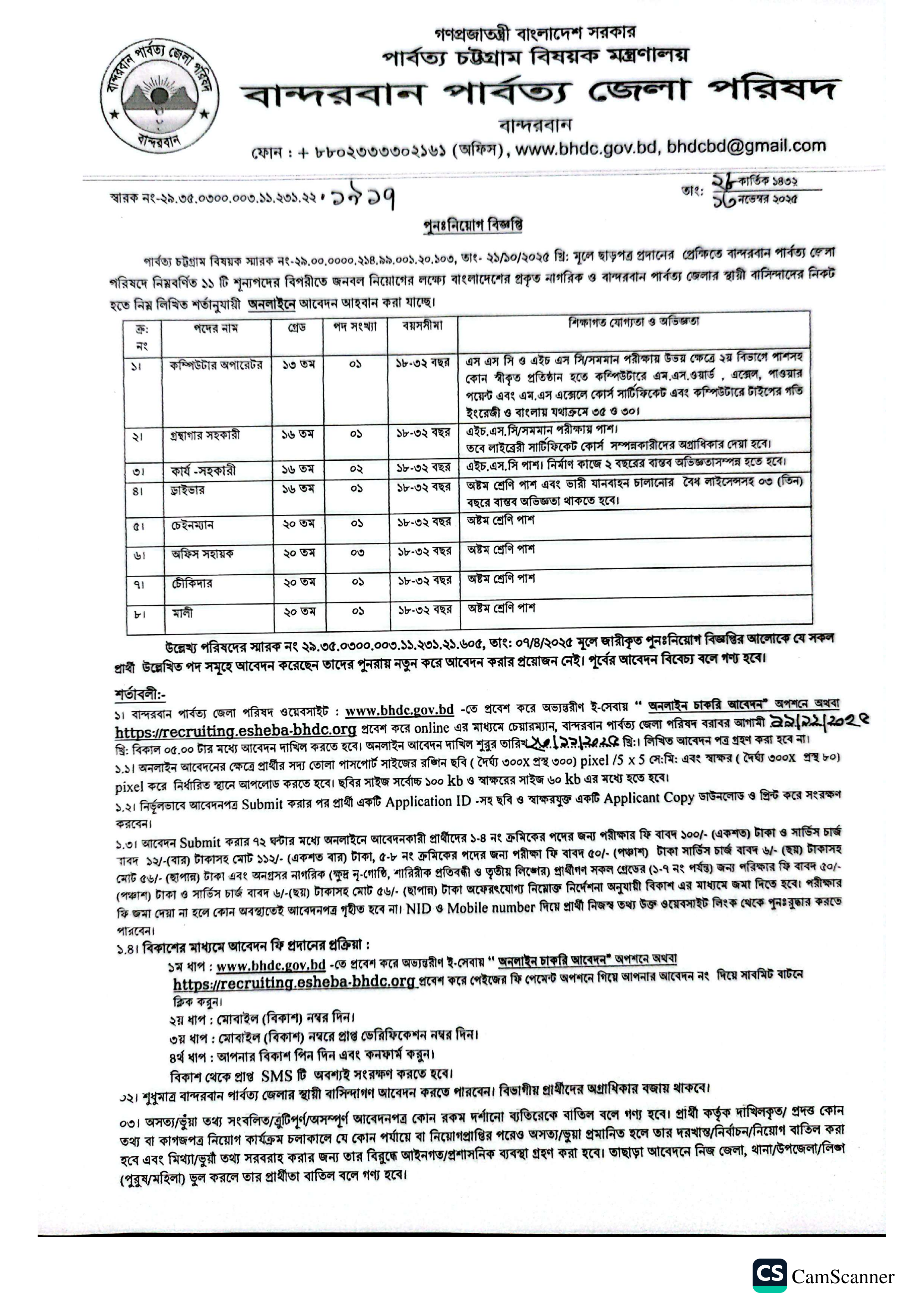 আবেদনের প্রক্রিয়া: আগ্রহী প্রার্থীরা বান্দরবান পার্বত্য জেলা পরিষদের ওয়েবসাইটের (www.bhdc.gov.bd) অভ্যন্তরীণ ই-সেবার “অনলাইন চাকরি আবেদন” অপশনের মাধ্যমে অনলাইনে আবেদন করতে পারবেন। লিখিত আবেদনপত্র গ্রহণযোগ্য নয়। শুধুমাত্র বান্দরবান পার্বত্য জেলার স্থায়ী বাসিন্দাগণ আবেদন করতে পারবেন।