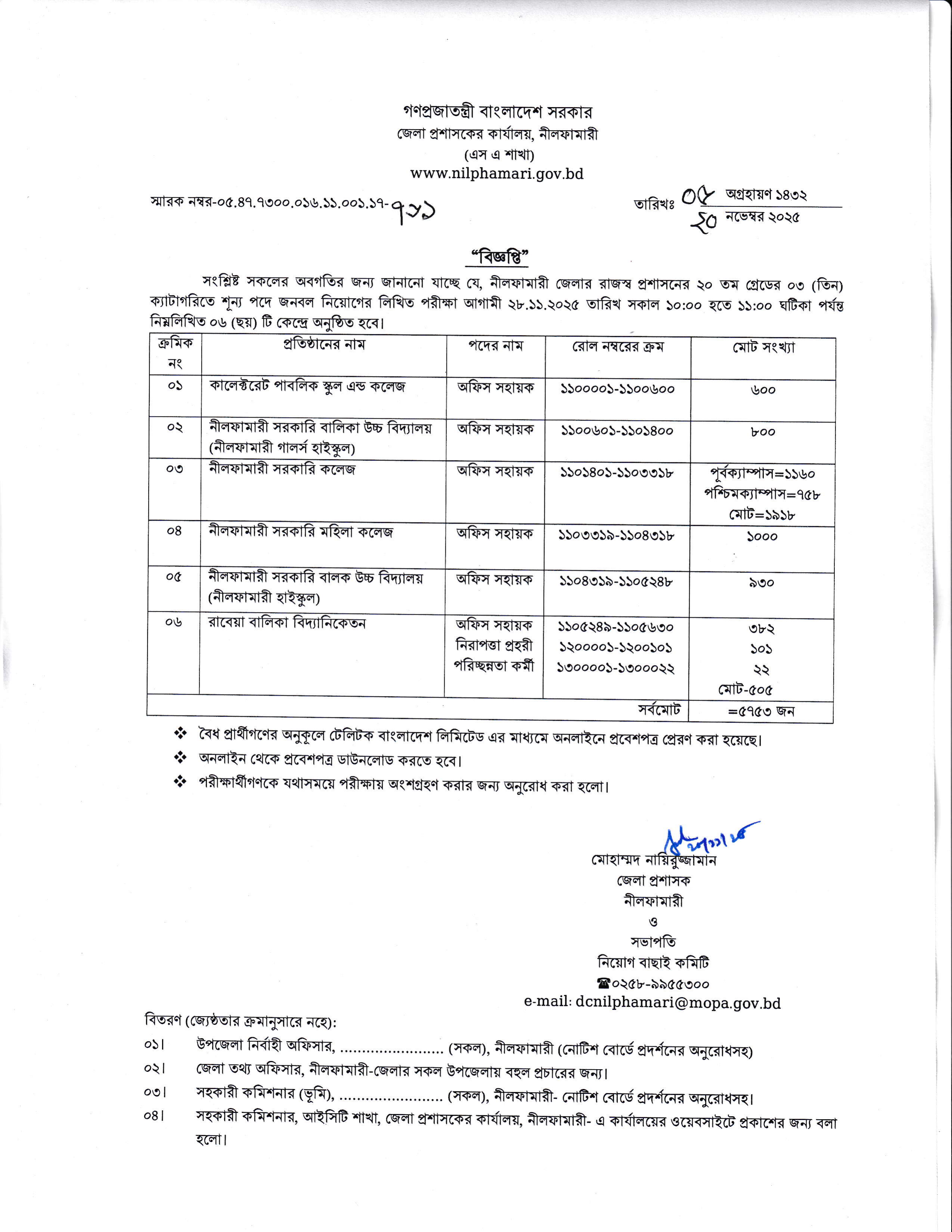 নীলফামারী জেলার রাজস্ব প্রশাসনের অধীনে ২০ তম গ্রেডের শূন্য পদে জনবল নিয়োগের লিখিত পরীক্ষার সময়সূচী ঘোষণা করা হয়েছে। এই পরীক্ষা আগামী ২৮ নভেম্বর ২০২৫ তারিখ সকাল ১০:০০টা থেকে ১১:০০টা পর্যন্ত অনুষ্ঠিত হবে।