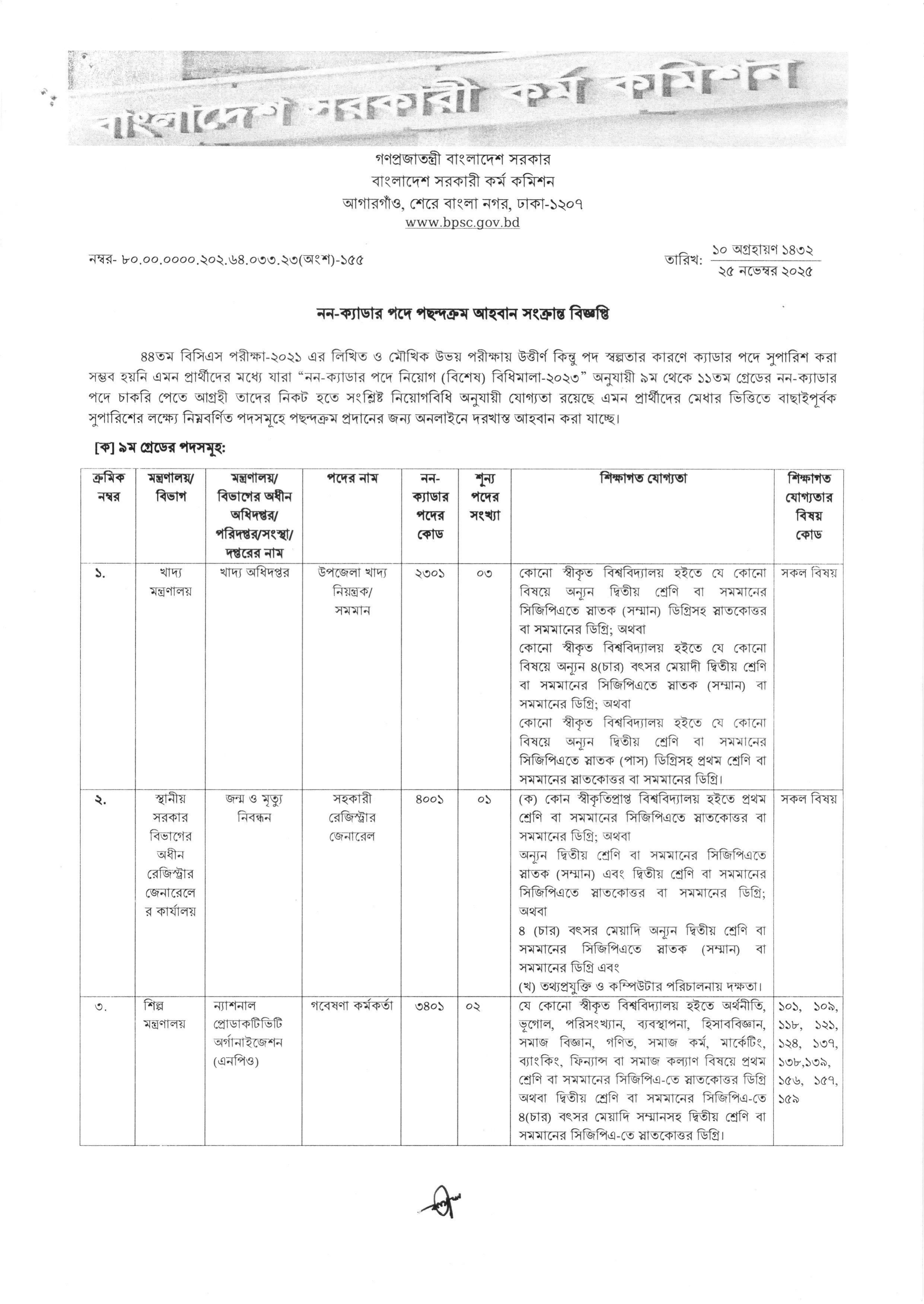 গণপ্রজাতন্ত্রী বাংলাদেশ সরকার এর বাংলাদেশ সরকারী কর্ম কমিশন কর্তৃক ৪৪তম বিসিএস পরীক্ষা-২০২১ এর নন-ক্যাডার পদসমূহের জন্য পছন্দক্রম আহবান সংক্রান্ত বিজ্ঞপ্তি প্রকাশিত হয়েছে। এই বিজ্ঞপ্তির মাধ্যমে লিখিত ও মৌখিক উভয় পরীক্ষায় উত্তীর্ণ কিন্তু পদ স্বল্পতার কারণে ক্যাডার পদে সুপারিশ করা সম্ভব হয়নি এমন প্রার্থীদের নিকট হতে ৯ম, ১০ম এবং ১১তম গ্রেডের নন-ক্যাডার পদসমূহে পছন্দক্রম প্রদানের জন্য অনলাইনে দরখাস্ত আহবান করা হচ্ছে।