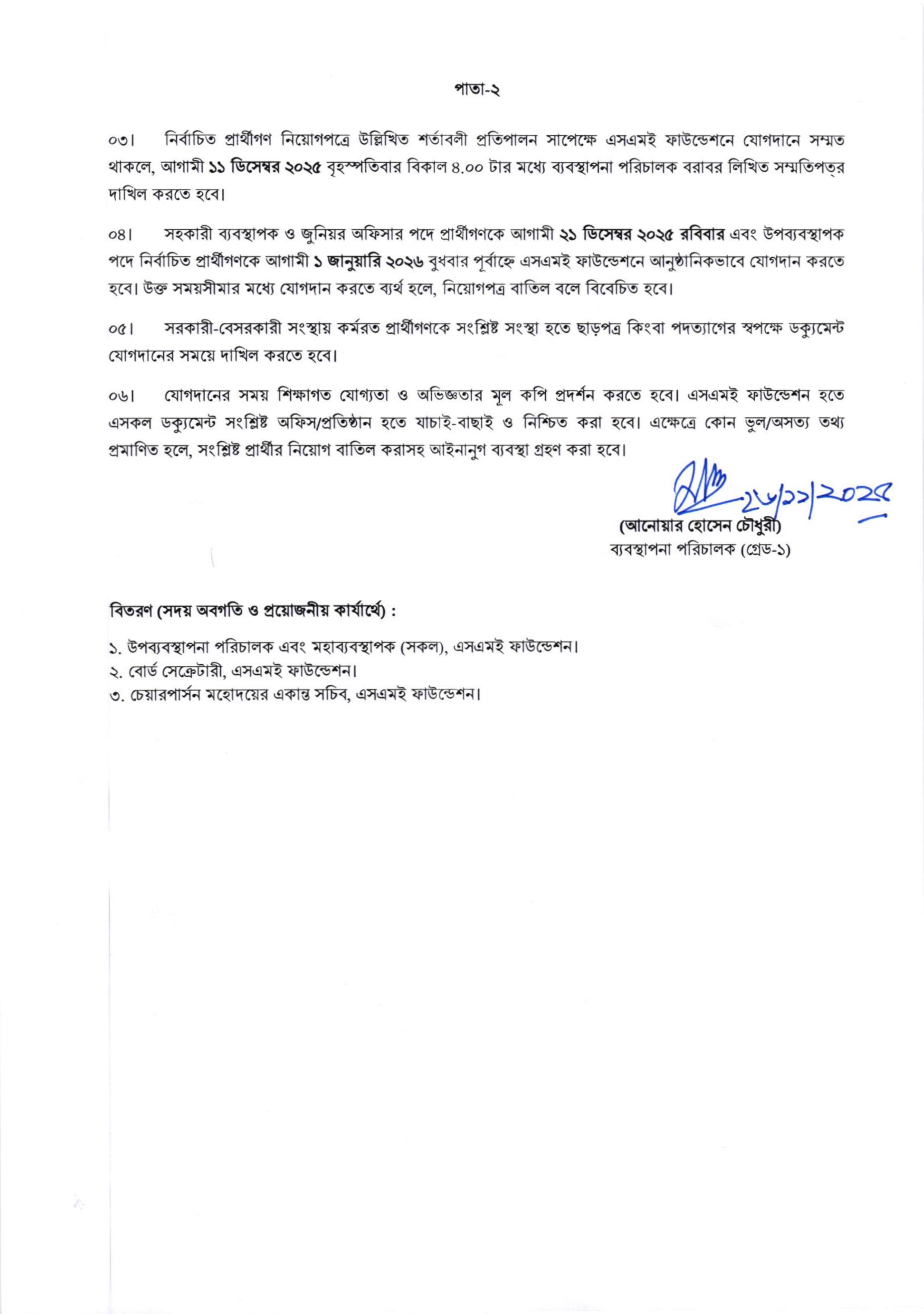 সহকারী ব্যবস্থাপক ও জুনিয়র অফিসার পদে নির্বাচিত প্রার্থীগণকে ২১ ডিসেম্বর ২০২৫ রবিবার এবং উপব্যবস্থাপক পদে নির্বাচিত প্রার্থীগণকে ০১ জানুয়ারি ২০২৬ বুধবার পূর্বাহ্ন এসএমই ফাউন্ডেশনে যোগদান করতে হবে। নির্ধারিত সময়ের মধ্যে যোগদান করতে ব্যর্থ হলে নিয়োগপত্র বাতিল বলে গণ্য হবে।