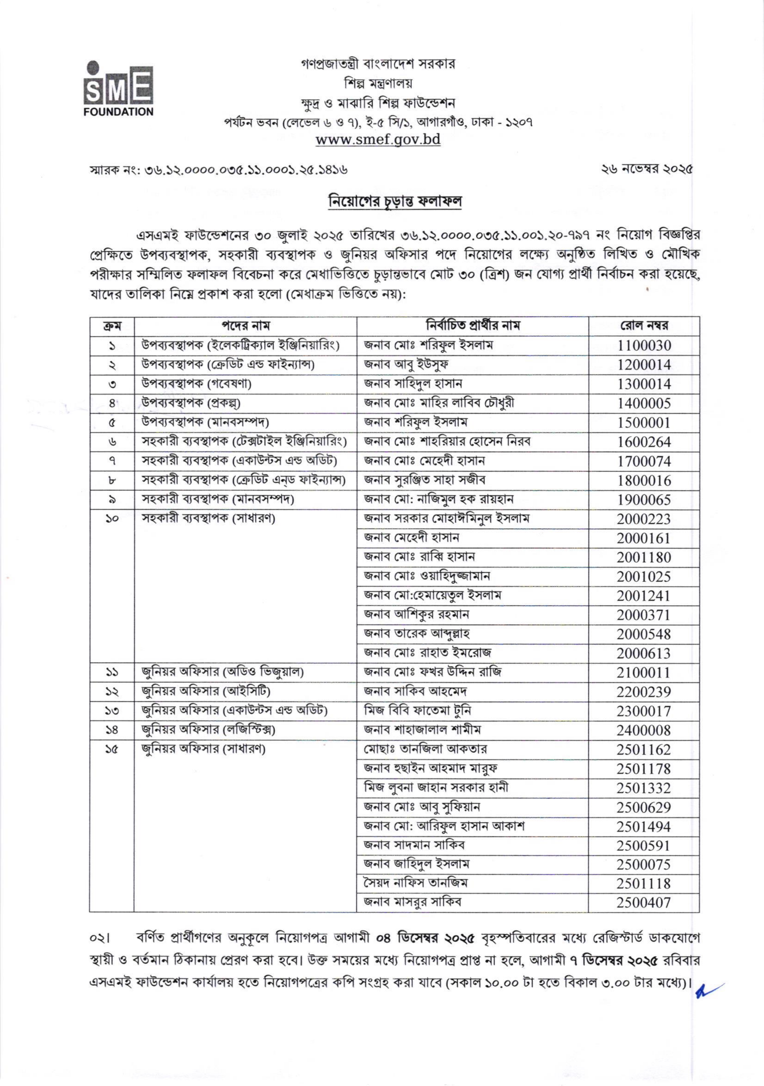 নির্বাচিত প্রার্থীদের অনুকূলে ০৪ ডিসেম্বর ২০২৫ তারিখের মধ্যে রেজিস্টার্ড ডাকযোগে নিয়োগপত্র প্রেরণ করা হবে। যদি উক্ত সময়ের মধ্যে নিয়োগপত্র না পাওয়া যায়, তবে ০৭ ডিসেম্বর ২০২৫ রবিবার সকাল ১০:০০টা থেকে বিকাল ৩:০০টার মধ্যে এসএমই ফাউন্ডেশন কার্যালয় থেকে নিয়োগপত্রের কপি সংগ্রহ করা যাবে।