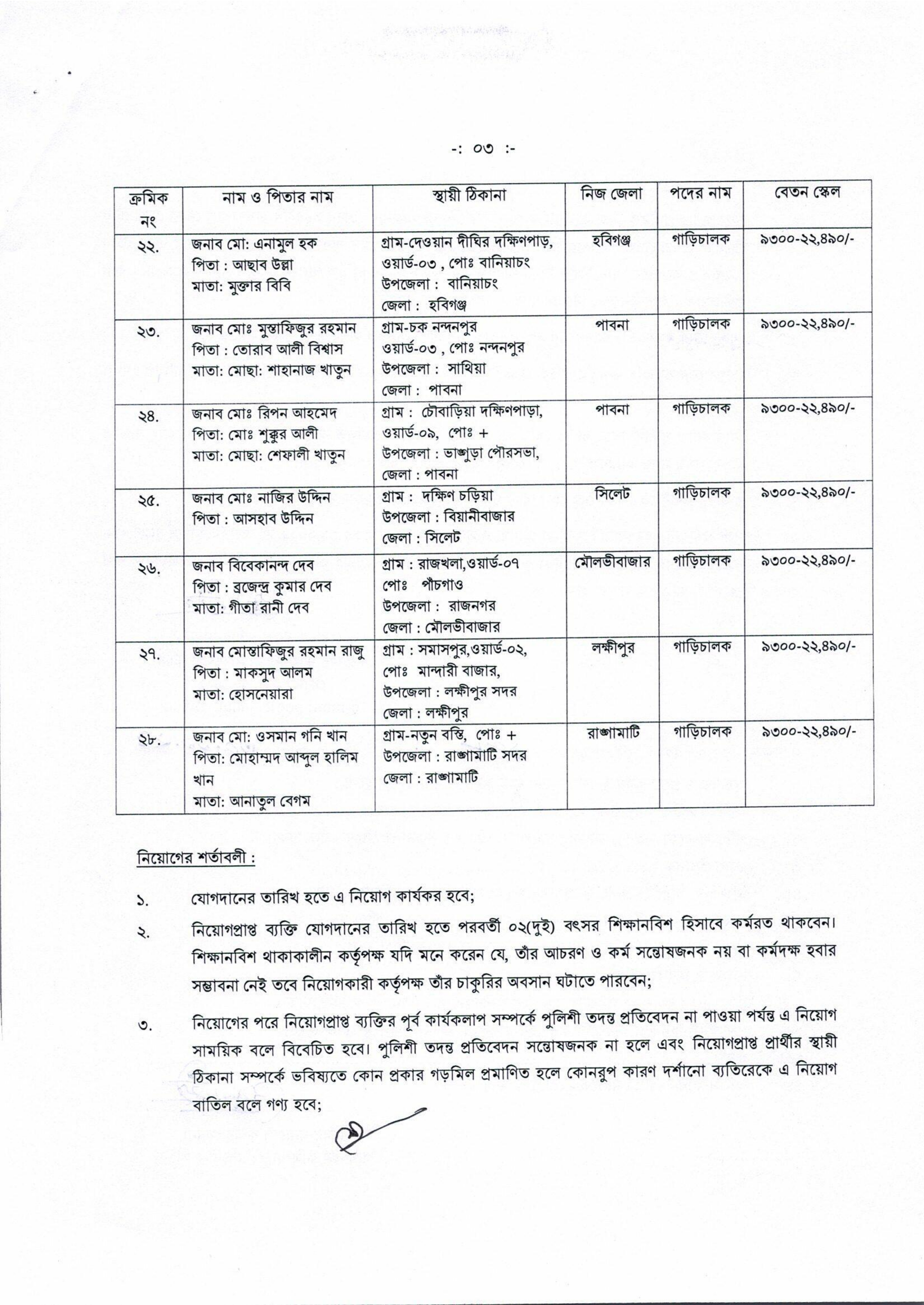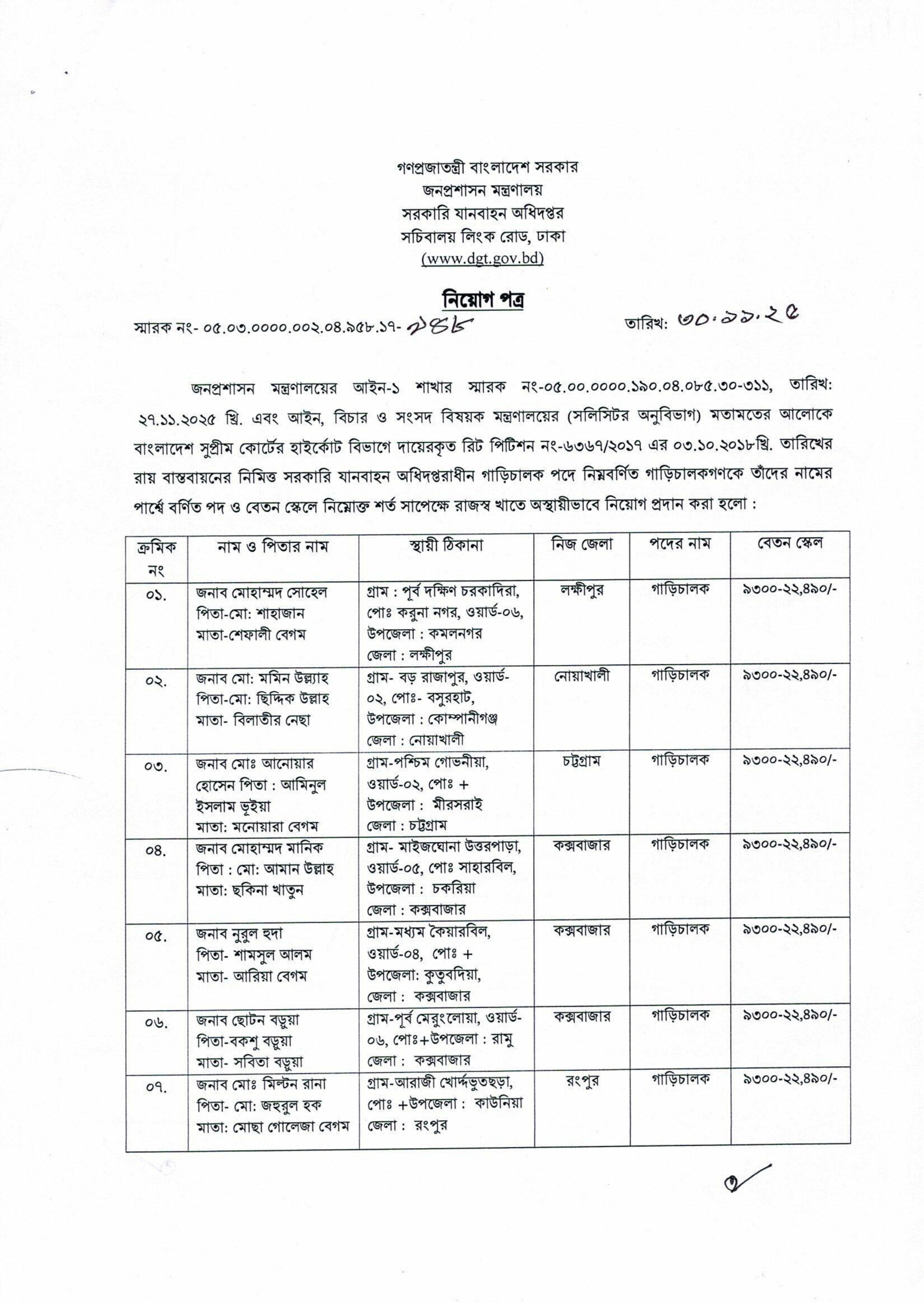জনপ্রশাসন মন্ত্রণালয়ের অধীনে সরকারি যানবাহন অধিদপ্তর কর্তৃক গাড়িচালক পদে নিয়োগপত্র প্রকাশ করা হয়েছে। বাংলাদেশ সুপ্রীম কোর্টের হাইকোর্ট বিভাগে দায়েরকৃত রিট পিটিশন নং-৬৩৬৭/২০১৭ এর রায় বাস্তবায়নের নিমিত্ত মোট ২৯ জন প্রার্থীকে অস্থায়ীভাবে নিয়োগ প্রদান করা হয়েছে।