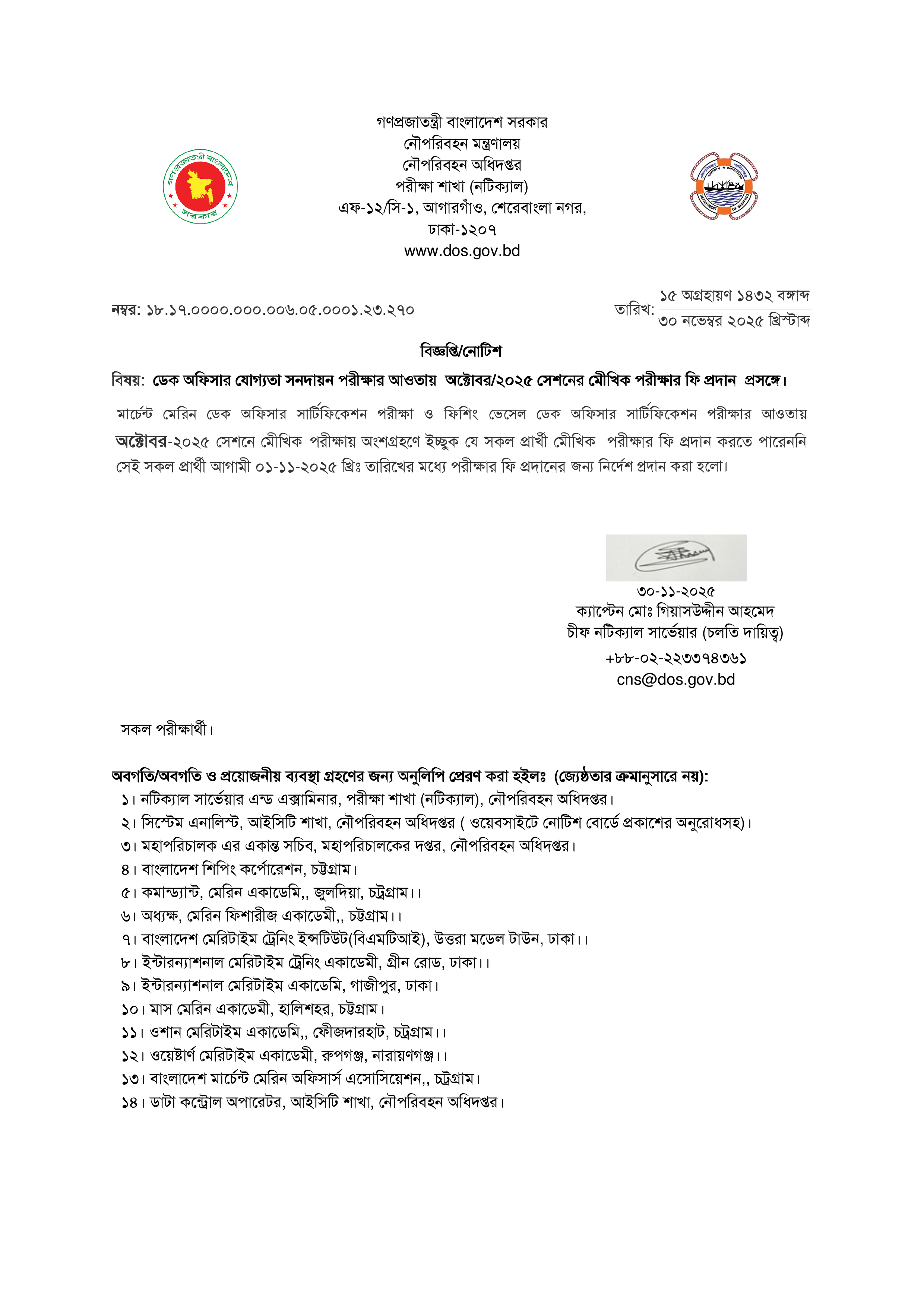 নৌপরিবহন অধিদপ্তর কর্তৃক প্রকাশিত এক বিজ্ঞপ্তি অনুযায়ী, ডেক অফিসার যোগ্যতা সনদায়ন পরীক্ষা এবং ফিশিং ভেসেল ডেক অফিসার সার্টিফিকেশন পরীক্ষার অক্টোবর/২০২৫ সেশনের মৌখিক পরীক্ষায় অংশগ্রহণে ইচ্ছুক যে সকল প্রার্থী এখনো পরীক্ষার ফি প্রদান করতে পারেননি, তাদের জন্য একটি গুরুত্বপূর্ণ নির্দেশনা দেওয়া হয়েছে।