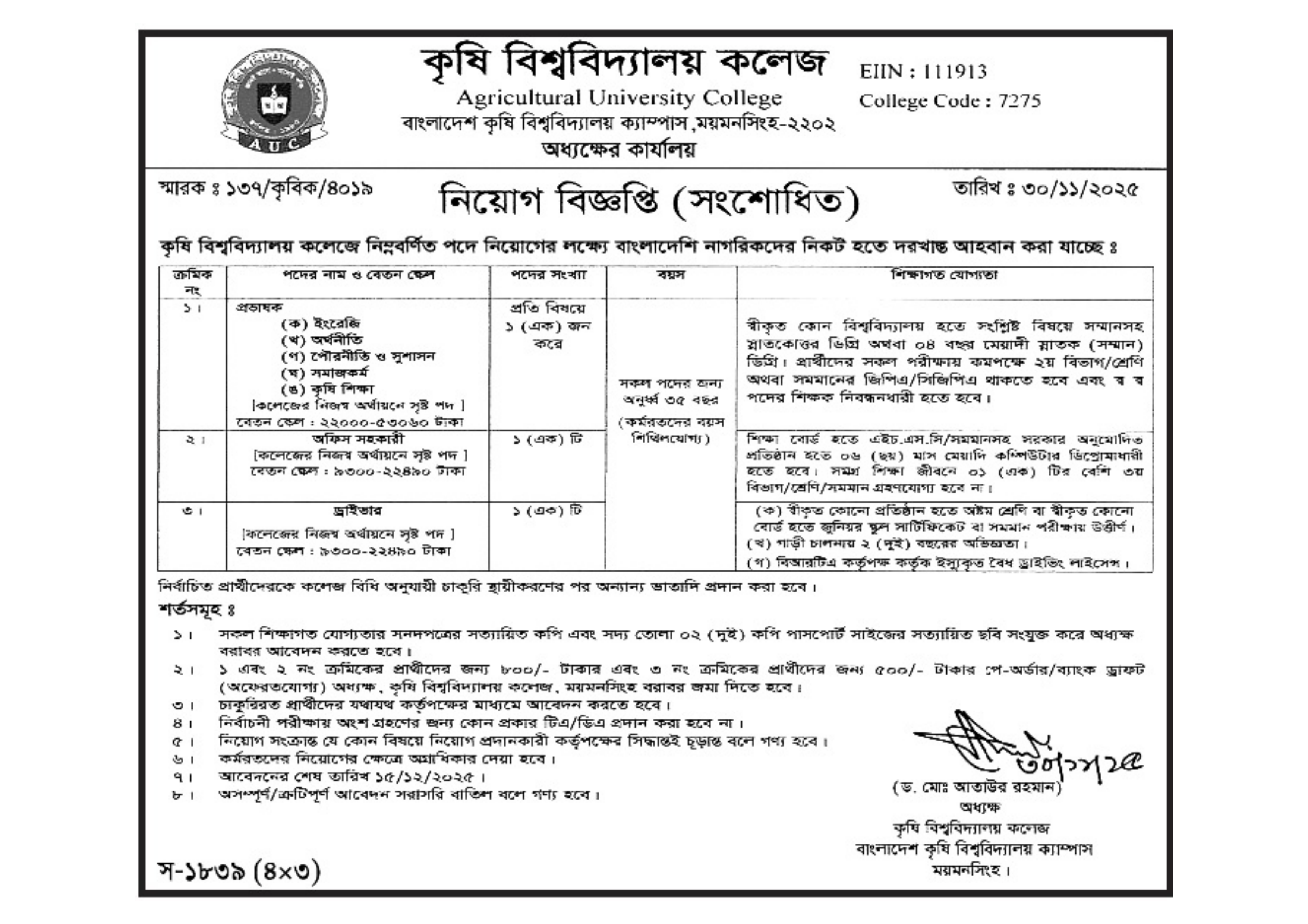 বাংলাদেশ কৃষি বিশ্ববিদ্যালয় কলেজ, ময়মনসিংহে বিভিন্ন পদে জনবল নিয়োগের জন্য একটি সংশোধিত নিয়োগ বিজ্ঞপ্তি প্রকাশিত হয়েছে। আগ্রহী যোগ্য প্রার্থীরা নির্ধারিত সময়ের মধ্যে আবেদন করতে পারবেন।