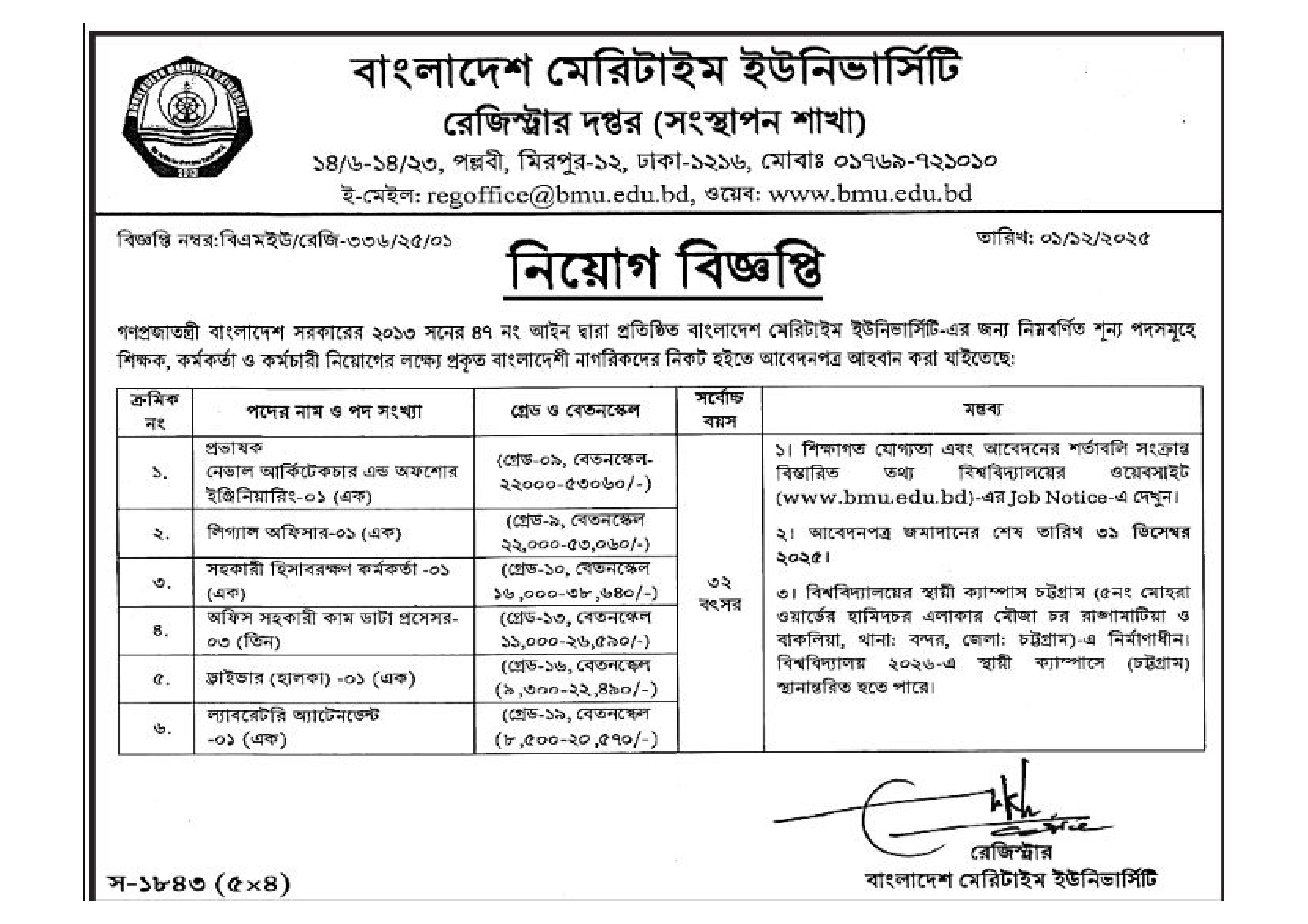 বয়স সংক্রান্ত তথ্য: শিক্ষাগত যোগ্যতা এবং আবেদন সংক্রান্ত বিস্তারিত তথ্য বিশ্ববিদ্যালয়ের ওয়েবসাইটে (www.bmureg.gov.bd) পাওয়া যাবে।