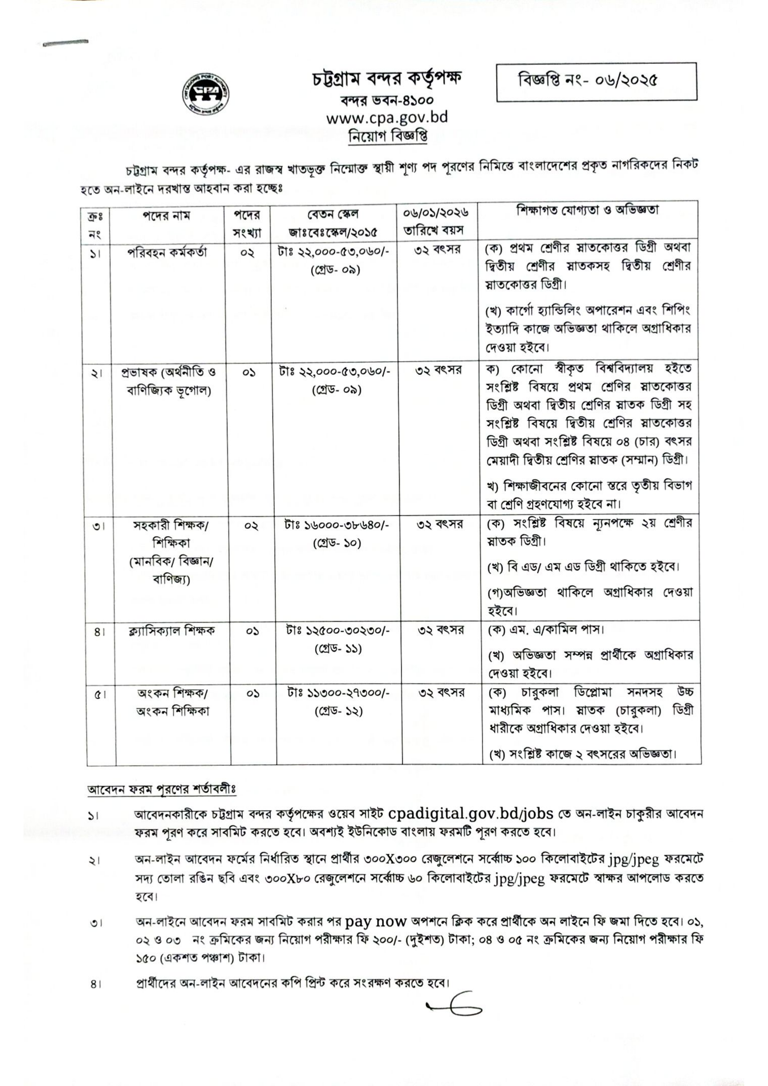 পরীক্ষার তারিখ, সময় ও স্থান: চট্টগ্রাম বন্দর কর্তৃপক্ষের ওয়েব সাইট (cpa.gov.bd/jobs) এবং মোবাইল ফোনে এসএমএস এর মাধ্যমে যথাসময়ে পরীক্ষার সময়সূচী জানানো হবে। প্রার্থীগণ ওয়েবসাইট থেকে পরীক্ষার প্রবেশপত্র/ইন্টারভিউ কার্ড ডাউনলোড করে সংগ্রহ করবেন। ডাকযোগে কোনো ইন্টারভিউ কার্ড প্রেরণ করা হবে না।