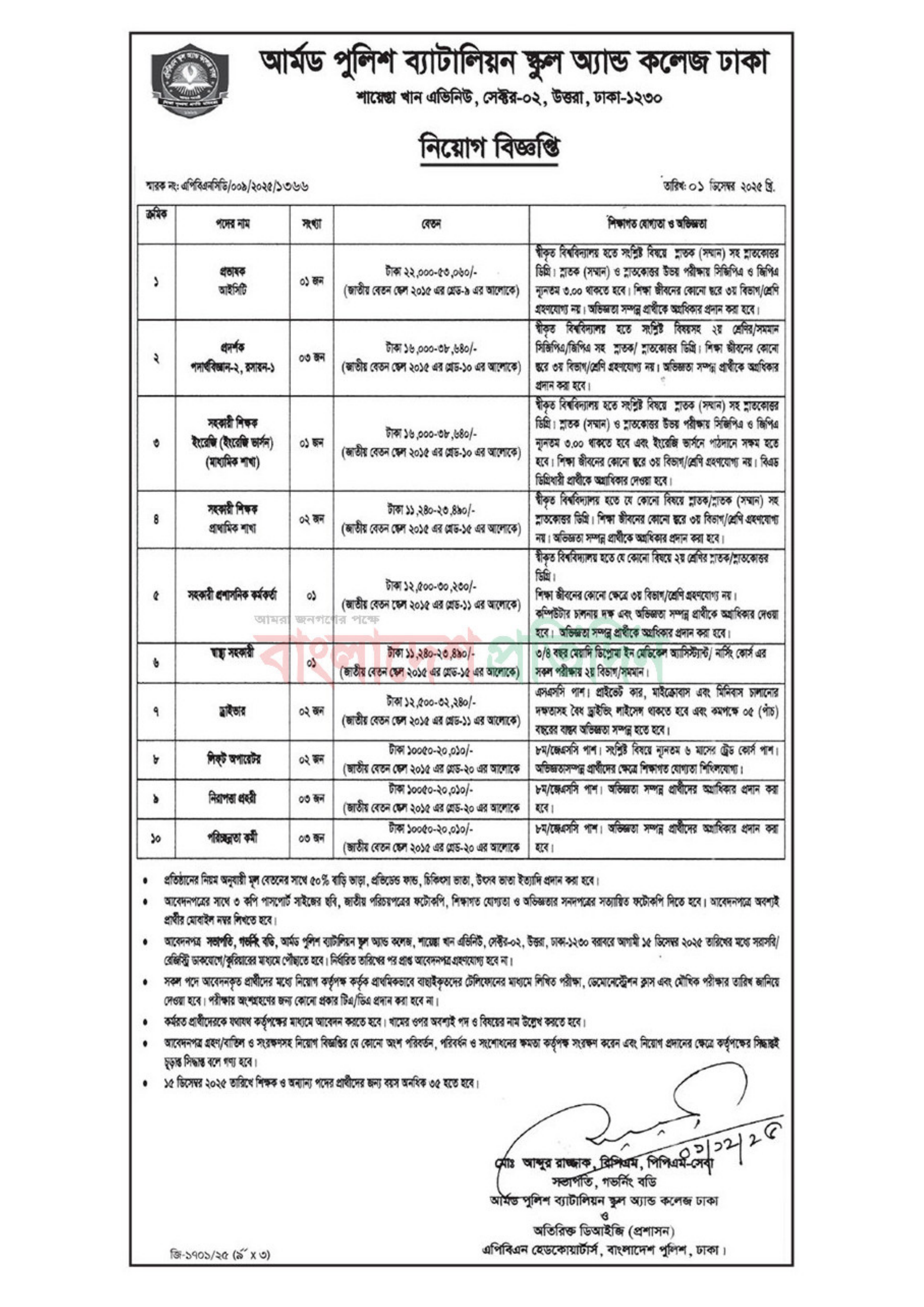 আর্মড পুলিশ ব্যাটালিয়ন স্কুল আ্যান্ড কলেজ ঢাকা বিভিন্ন পদে জনবল নিয়োগের জন্য একটি বিজ্ঞপ্তি প্রকাশ করেছে। আগ্রহী ও যোগ্য প্রার্থীরা আবেদন করতে পারবেন।