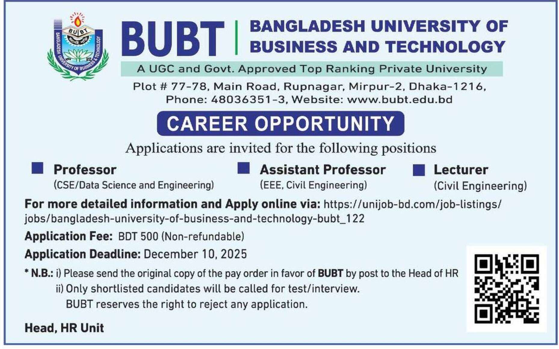 - BUBT-এর পক্ষে Pay Order-এর মূল কপি ডাকযোগে Head of HR-কে পাঠাতে হবে।