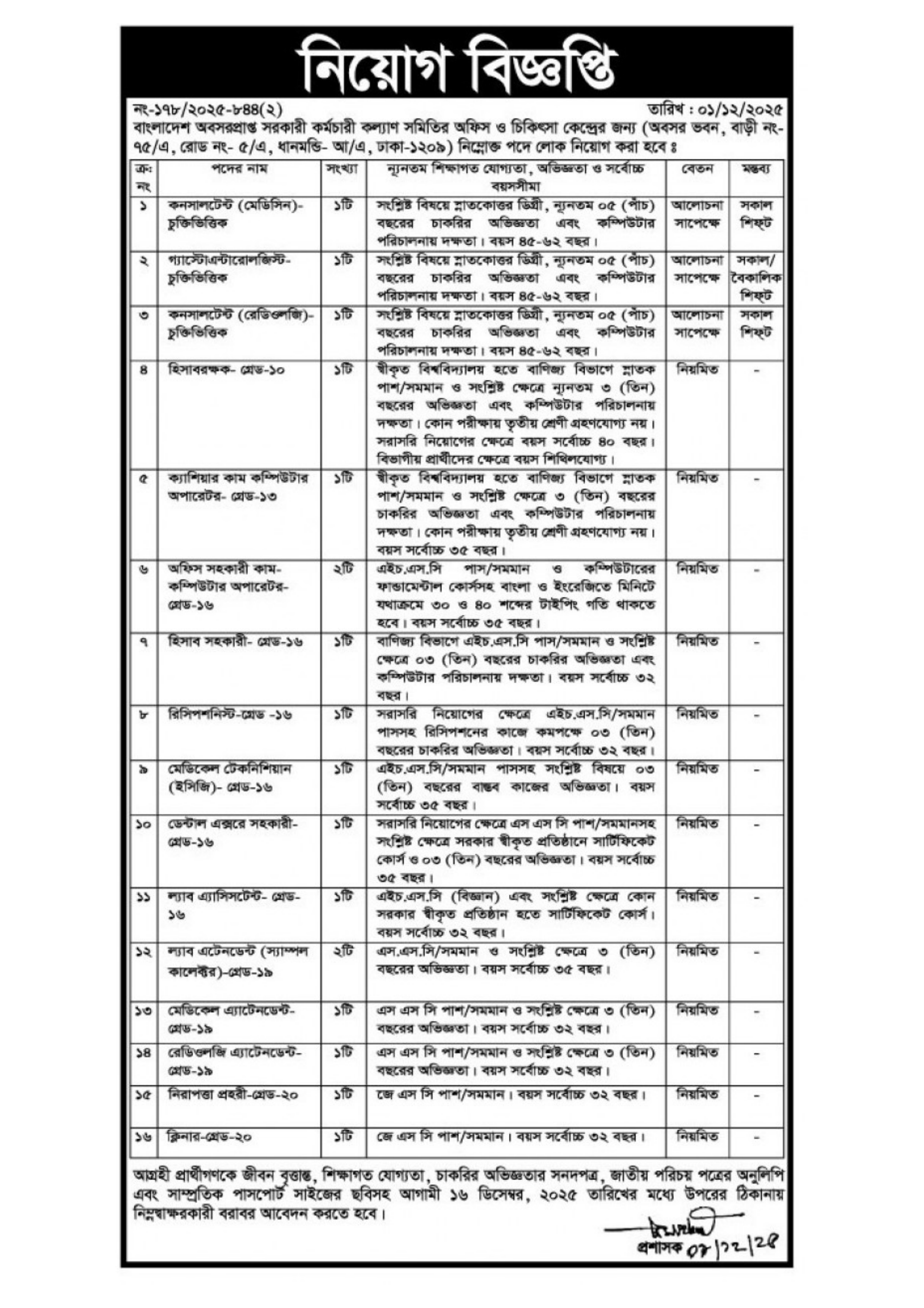 বাংলাদেশ অবসরপ্রাপ্ত সরকারী কর্মচারী কল্যাণ সমিতির অফিস ও চিকিৎসা কেন্দ্রের জন্য জনবল নিয়োগের বিজ্ঞপ্তি প্রকাশিত হয়েছে। পদসংখ্যা বিজ্ঞপ্তিতে নির্দিষ্ট করা হয়নি। নিয়োগযোগ্য পদসমূহের যোগ্যতা নিচে দেওয়া হলো: