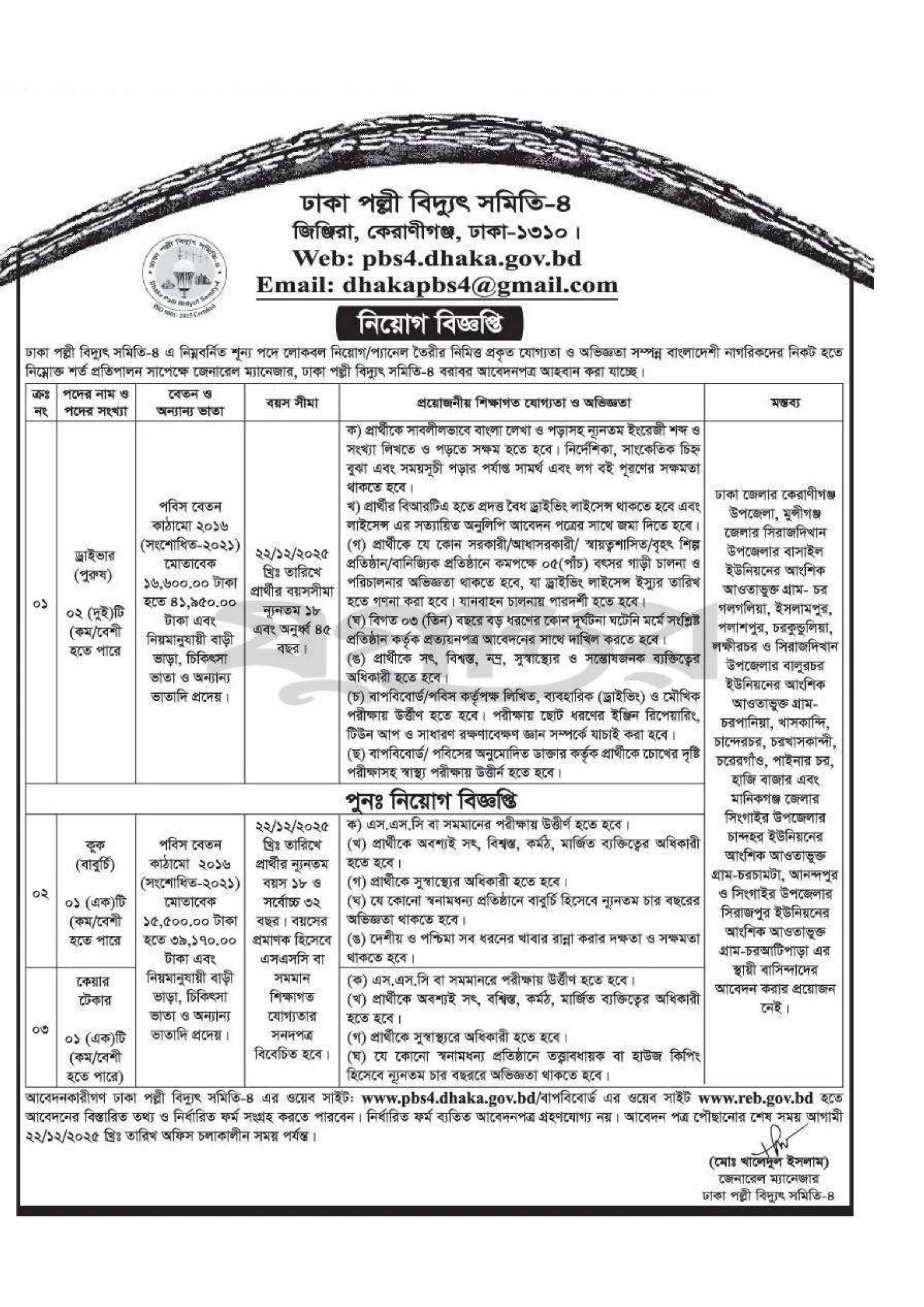ঢাকা পল্লী বিদ্যুৎ সমিতি-৪ এ শূন্য পদে জনবল নিয়োগের জন্য যোগ্য ও অভিজ্ঞ বাংলাদেশী নাগরিকদের নিকট থেকে আবেদনপত্র আহ্বান করা হয়েছে। আগ্রহী প্রার্থীরা নিচে উল্লিখিত পদসমূহের জন্য আবেদন করতে পারবেন: