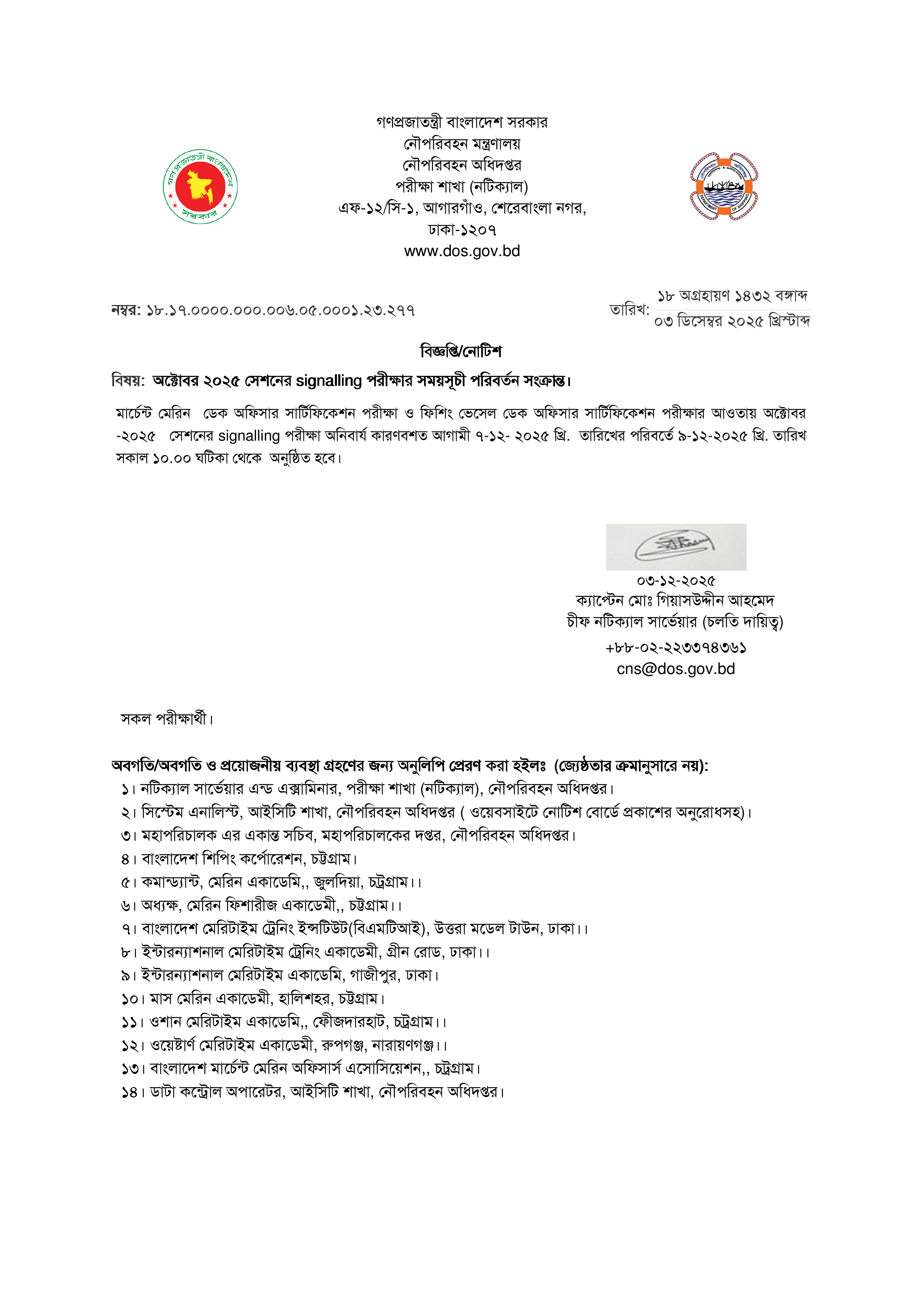 নৌপরিবহন অধিদপ্তর কর্তৃক আয়োজিত মার্চেন্ট মেরিন ডেক অফিসার সার্টিফিকেশন পরীক্ষা ও ফিশিং ভেসেল ডেক অফিসার সার্টিফিকেশন পরীক্ষার অক্টোবর-২০২৫ সেশনের সময়সূচী পরিবর্তন করা হয়েছে।