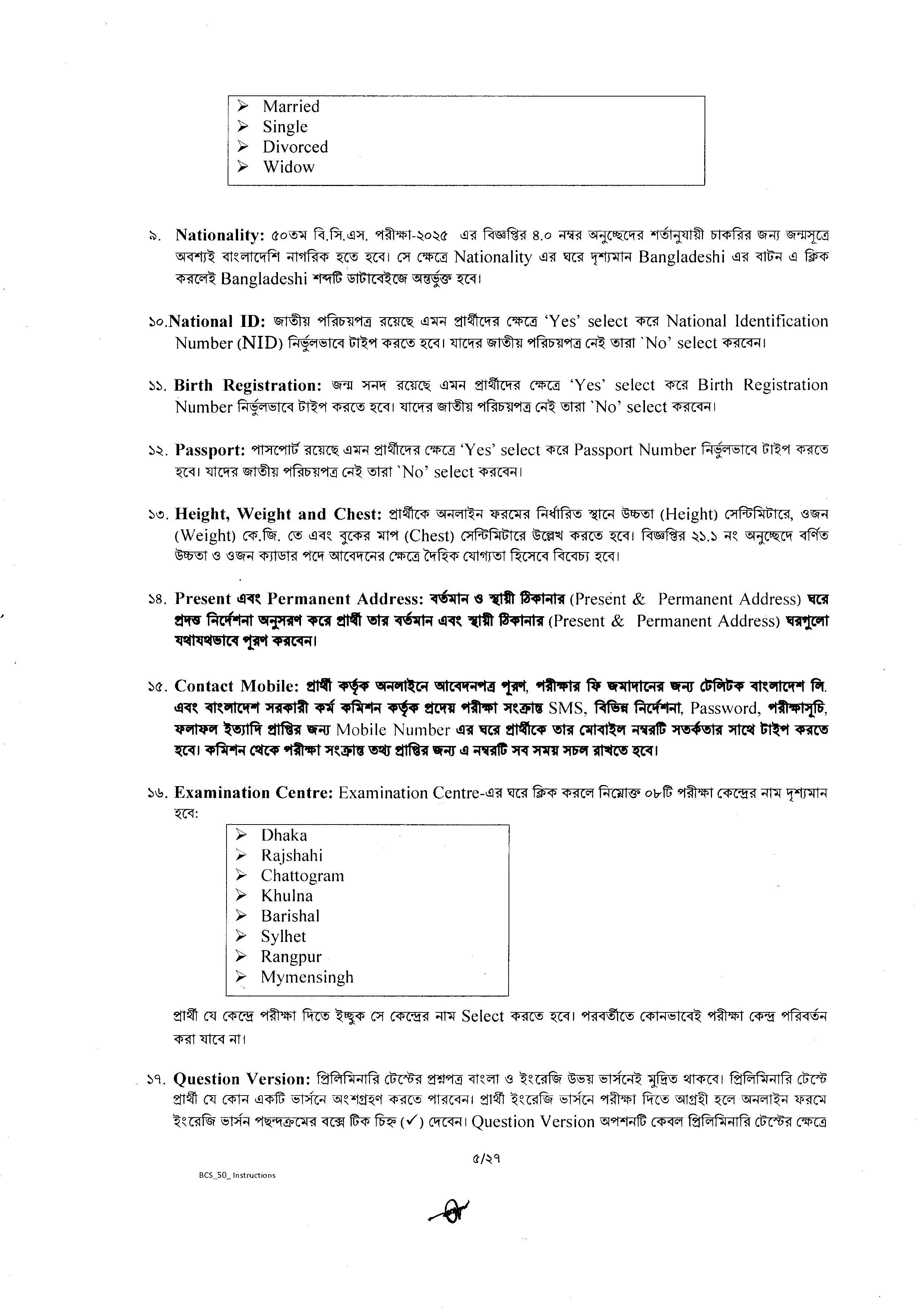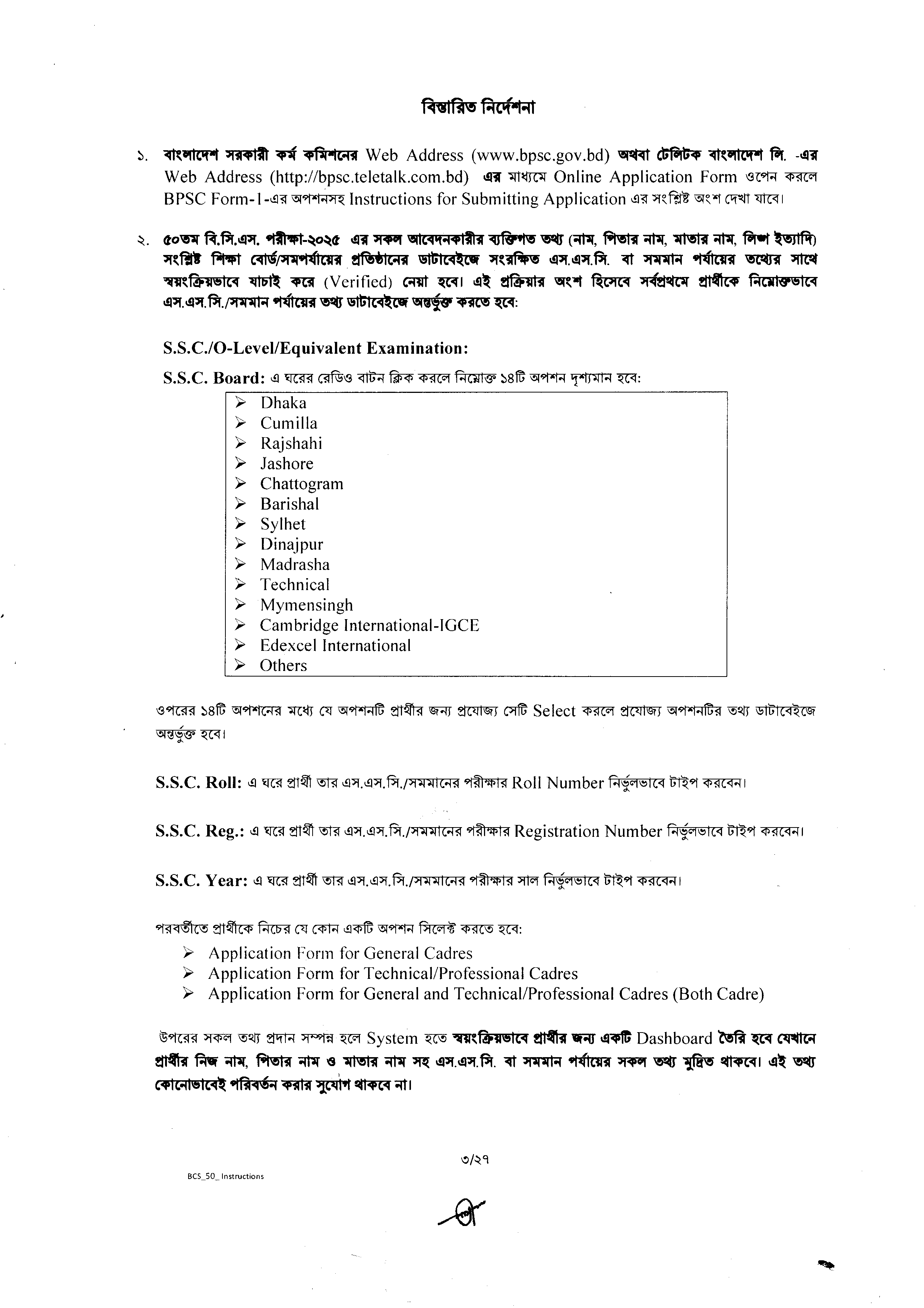 বাংলাদেশ সরকারী কর্ম কমিশন (বিপিএসসি) ৫০তম বি.সি.এস. পরীক্ষা-২০২৫ এর জন্য অনলাইন আবেদনপত্র পূরণ, পরীক্ষার ফি জমাদান এবং প্রবেশপত্র প্রাপ্তি সংক্রান্ত বিস্তারিত নির্দেশনা প্রকাশ করেছে। আগ্রহী প্রার্থীরা বিপিএসসির ওয়েবসাইট (bpsc.gov.bd) অথবা টেলিটক বাংলাদেশ লিমিটেড (bpsc.teletalk.com.bd) এর মাধ্যমে আবেদন করতে পারবেন।