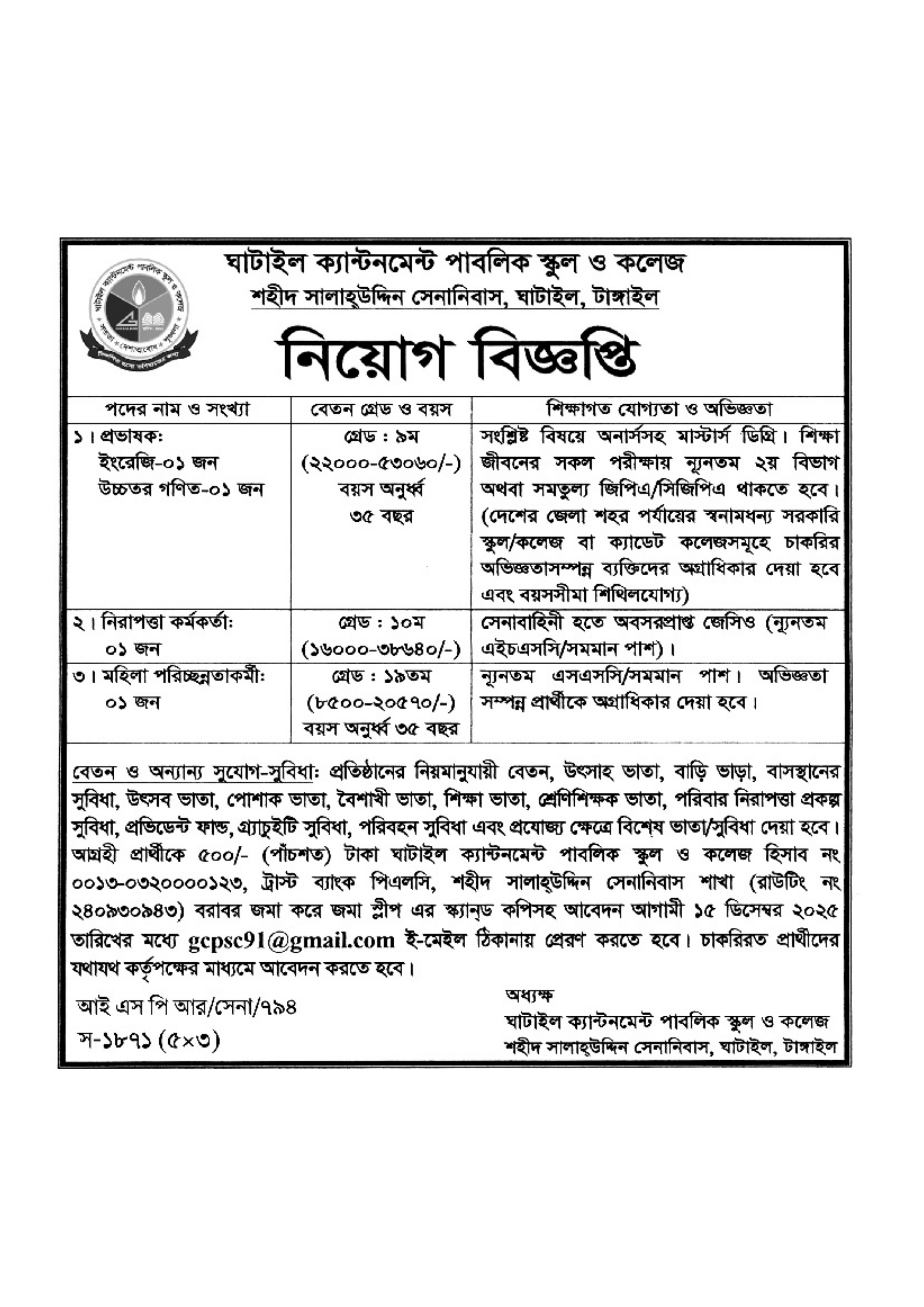 ঘাটাইল ক্যান্টনমেন্ট পাবলিক স্কুল ও কলেজ একটি নতুন নিয়োগ বিজ্ঞপ্তি প্রকাশ করেছে। এই বিজ্ঞপ্তিতে আযহা প্রার্থীদের নিকট থেকে আবেদন আহ্বান করা হয়েছে।