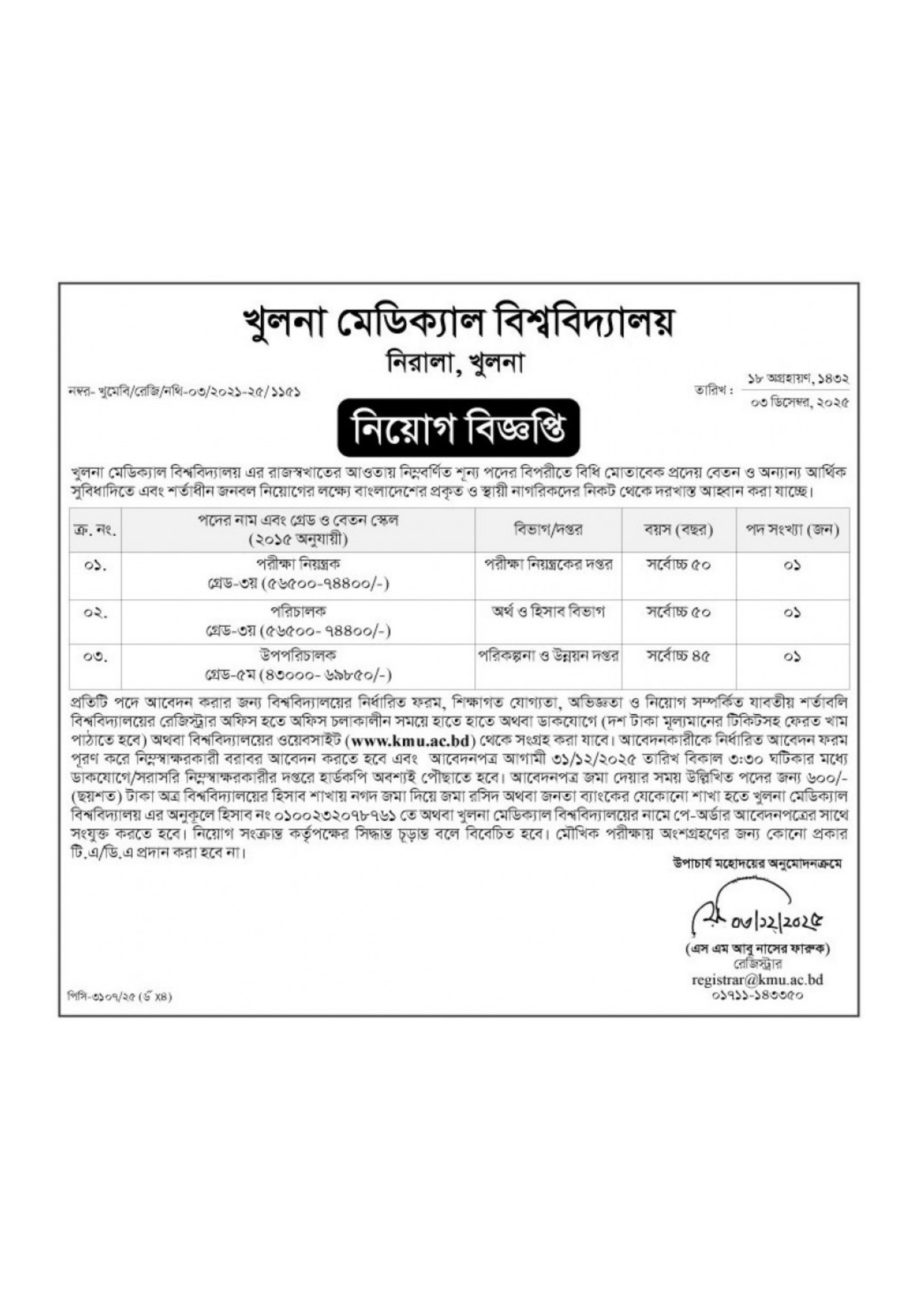পূরণকৃত আবেদনপত্র আগামী ৩১/১২/২০২৫ তারিখ বিকাল ৩:৩০ ঘটিকার মধ্যে ডাকযোগে/সরাসরি নিম্নস্বাক্ষরকারীর দপ্তরে (রেজিস্ট্রার) হার্ডকপি অবশ্যই পৌঁছাতে হবে।