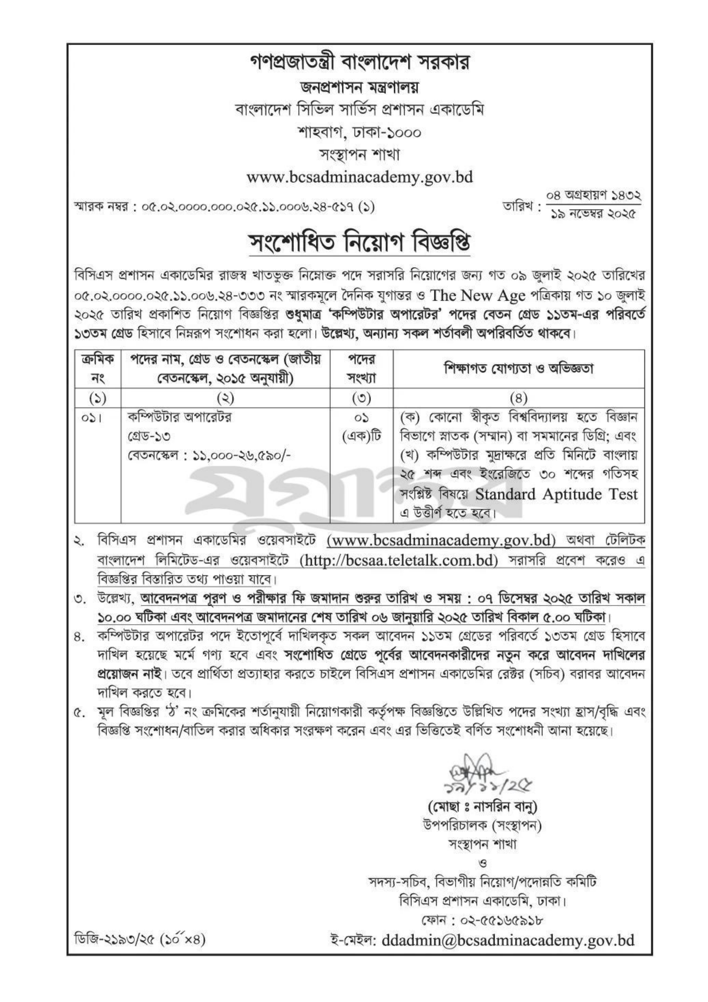 গণপ্রজাতন্ত্রী বাংলাদেশ সরকারের জনপ্রশাসন মন্ত্রণালয়ের আওতাধীন বিসিএস প্রশাসন একাডেমি কর্তৃক সংশোধিত একটি নিয়োগ বিজ্ঞপ্তি প্রকাশ করা হয়েছে।