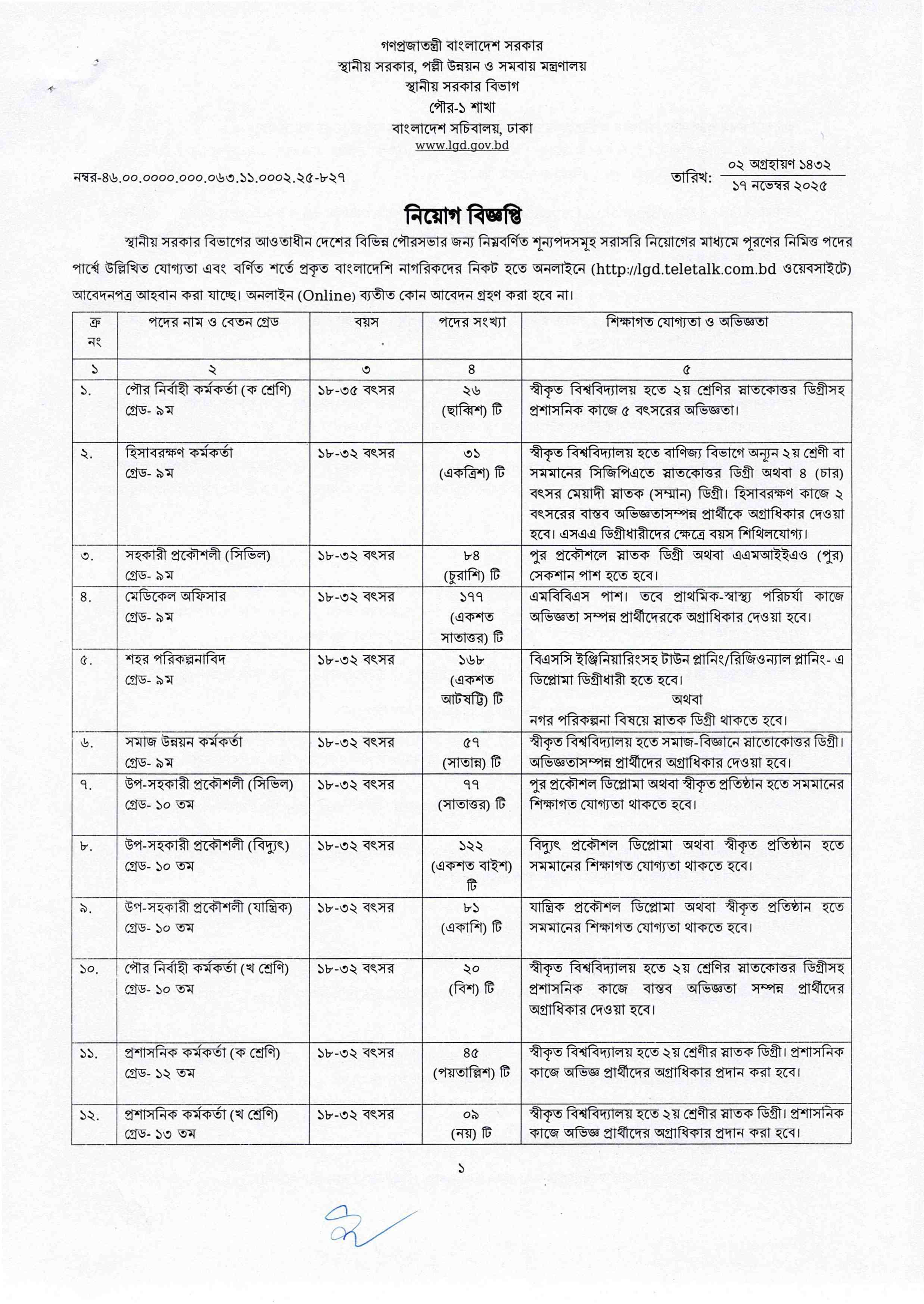 স্থানীয় সরকার বিভাগের আওতাধীন দেশের বিভিন্ন পৌরসভার জন্য নতুন নিয়োগ বিজ্ঞপ্তি প্রকাশিত হয়েছে। এই বিজ্ঞপ্তির মাধ্যমে সর্বমোট ৬৫৮টি শূন্যপদে যোগ্য বাংলাদেশি নাগরিকদের কাছ থেকে অনলাইনে আবেদনপত্র আহ্বান করা হয়েছে।