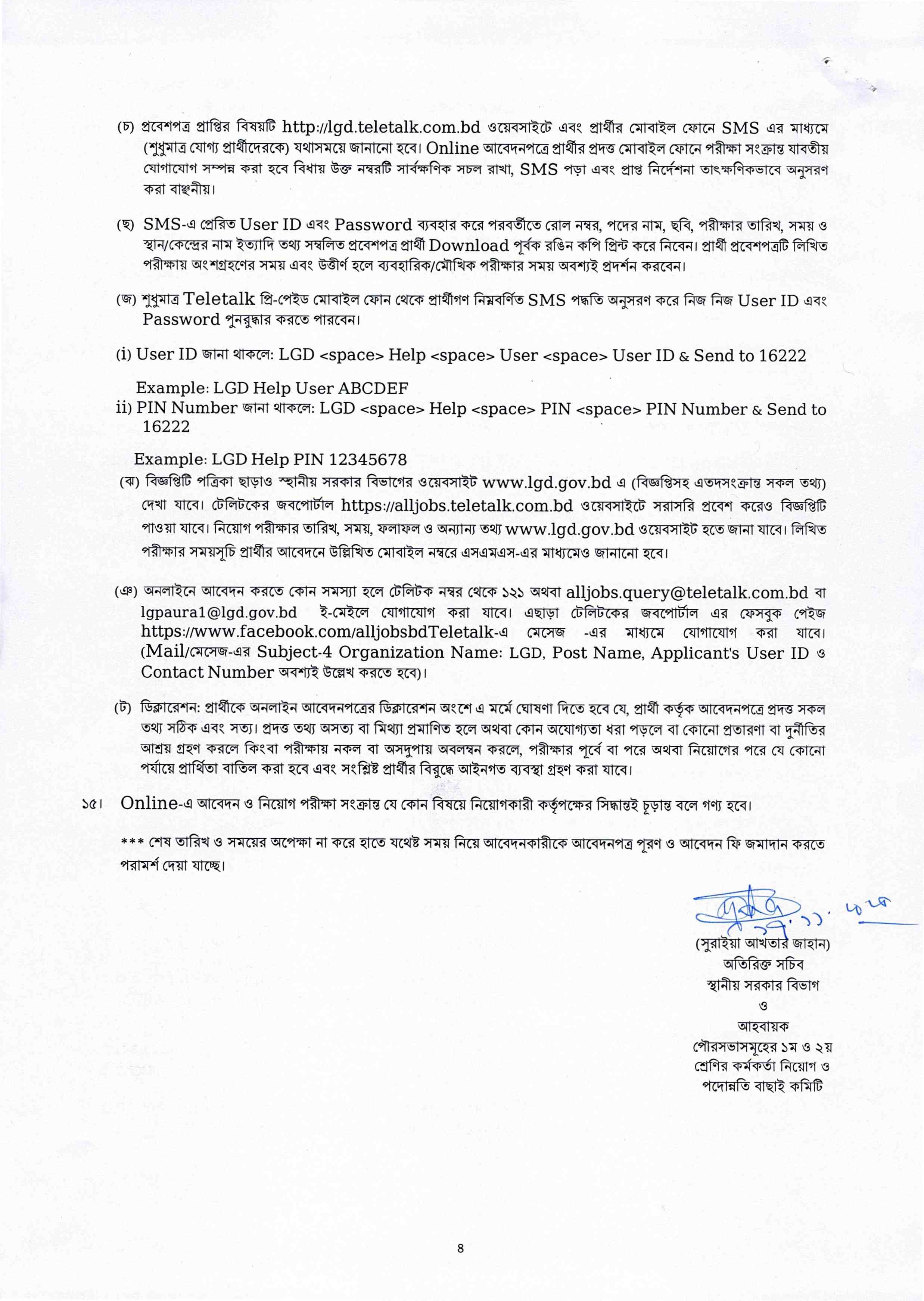 পরীক্ষার তারিখ, সময় ও স্থান: লিখিত ও মৌখিক পরীক্ষার তারিখ, সময় ও স্থান পরবর্তীতে এসএমএস এবং স্থানীয় সরকার বিভাগের ওয়েবসাইটে জানানো হবে।