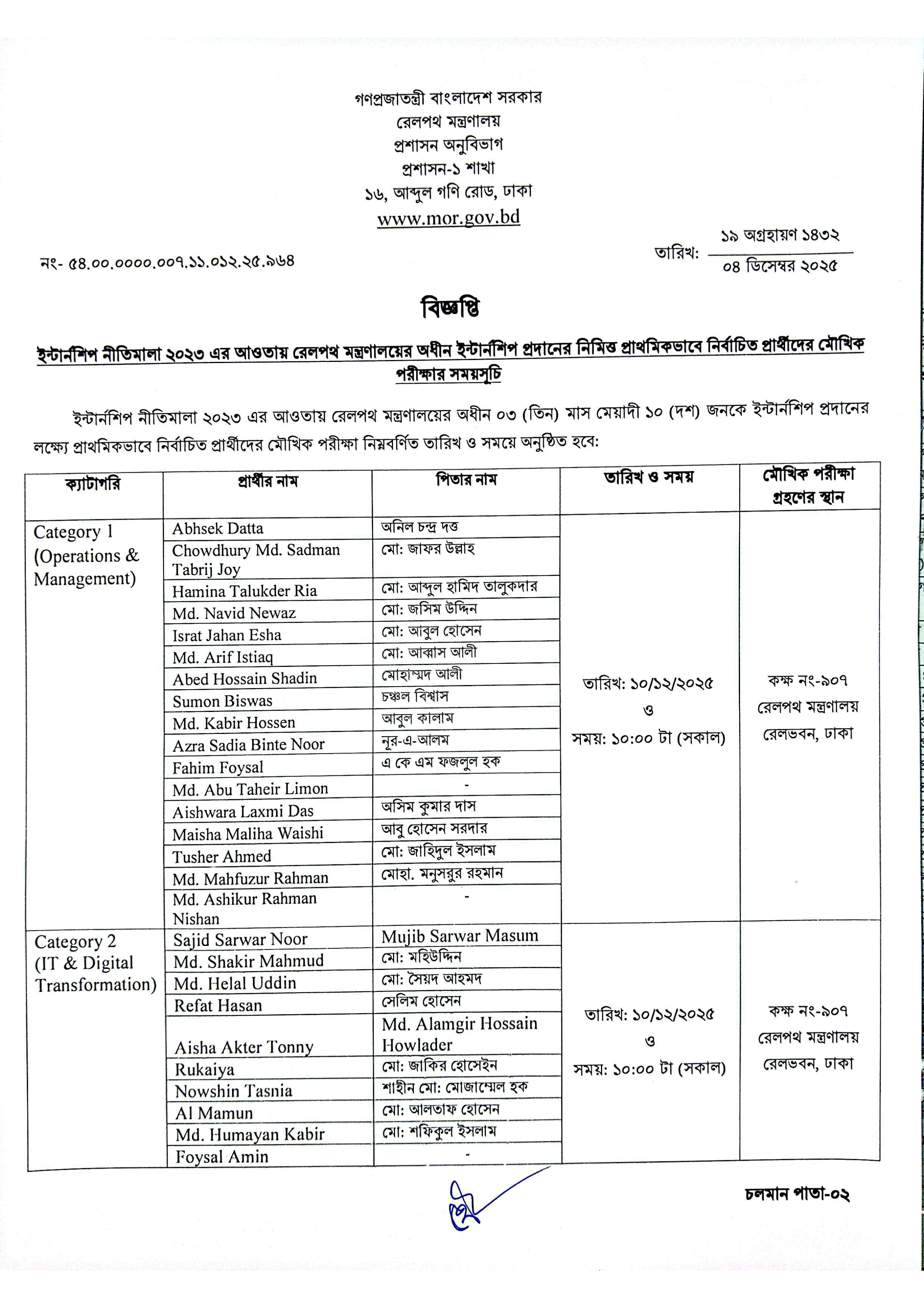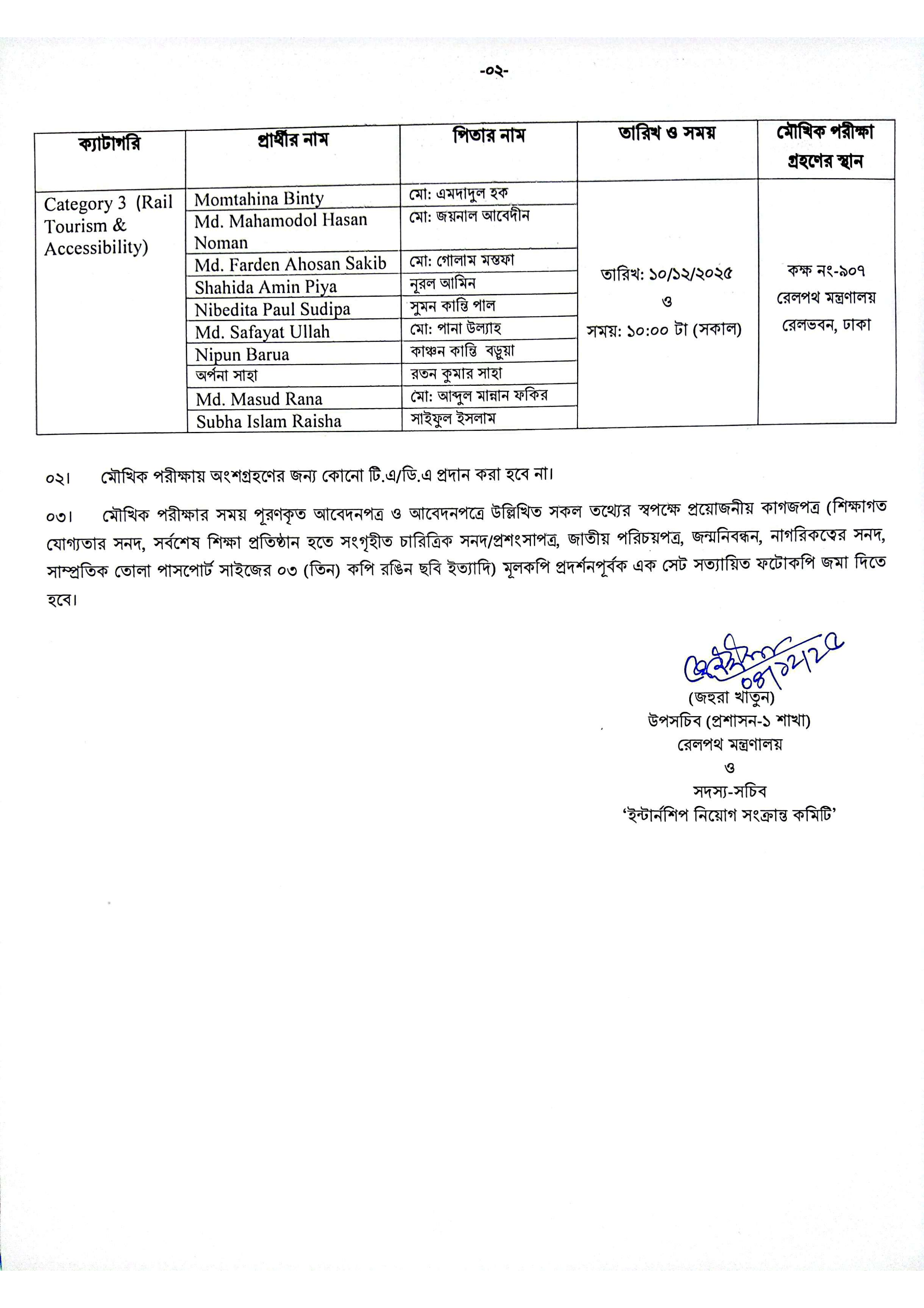 এই মৌখিক পরীক্ষা ১০ ডিসেম্বর ২০২৫ তারিখে সকাল ১০:০০ টায় অনুষ্ঠিত হবে। নির্বাচিত প্রার্থীদের মৌখিক পরীক্ষা রেলভবন, ঢাকা-এর কক্ষ নং-৯১০ এবং কক্ষ নং-৯০৭-এ অনুষ্ঠিত হবে।